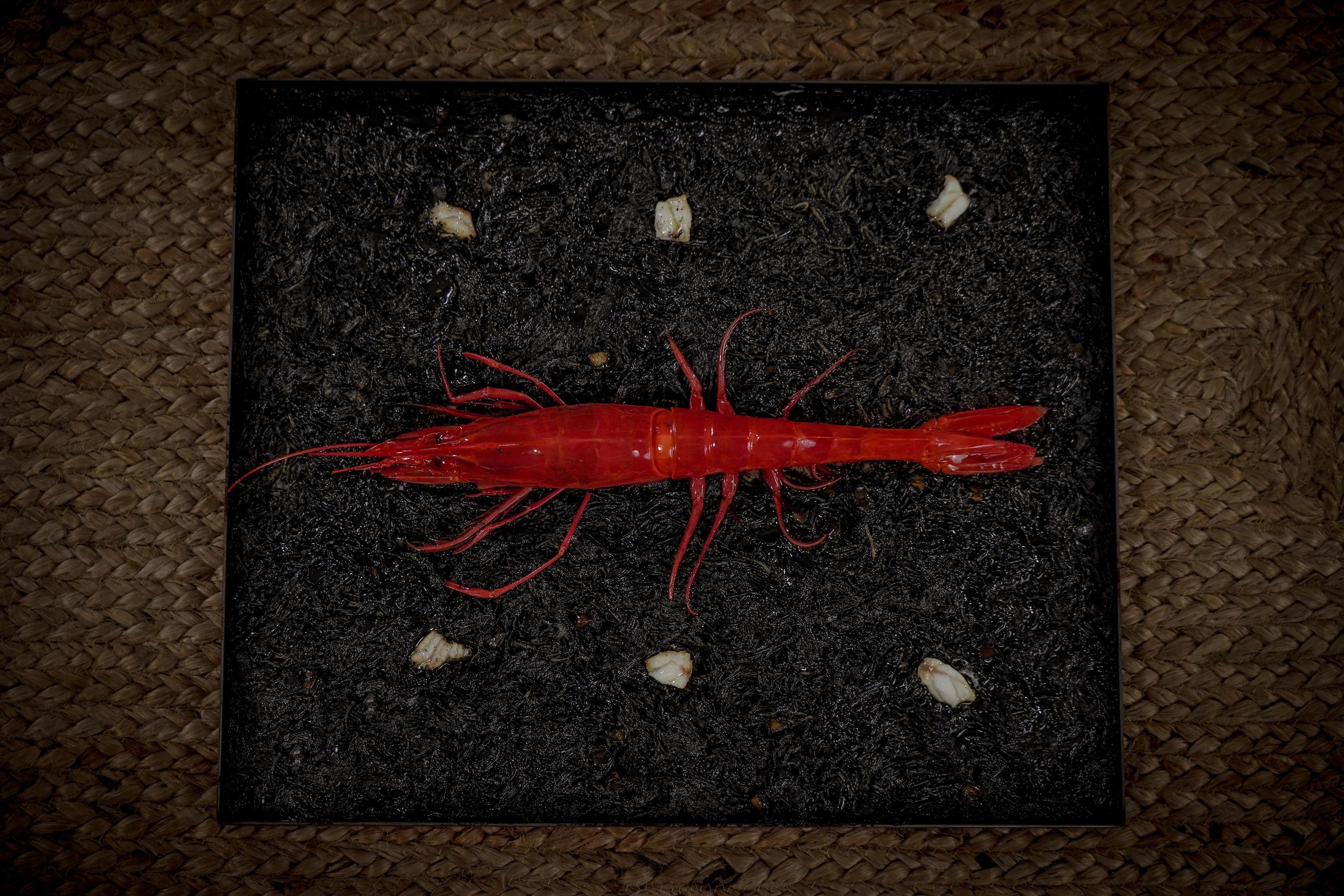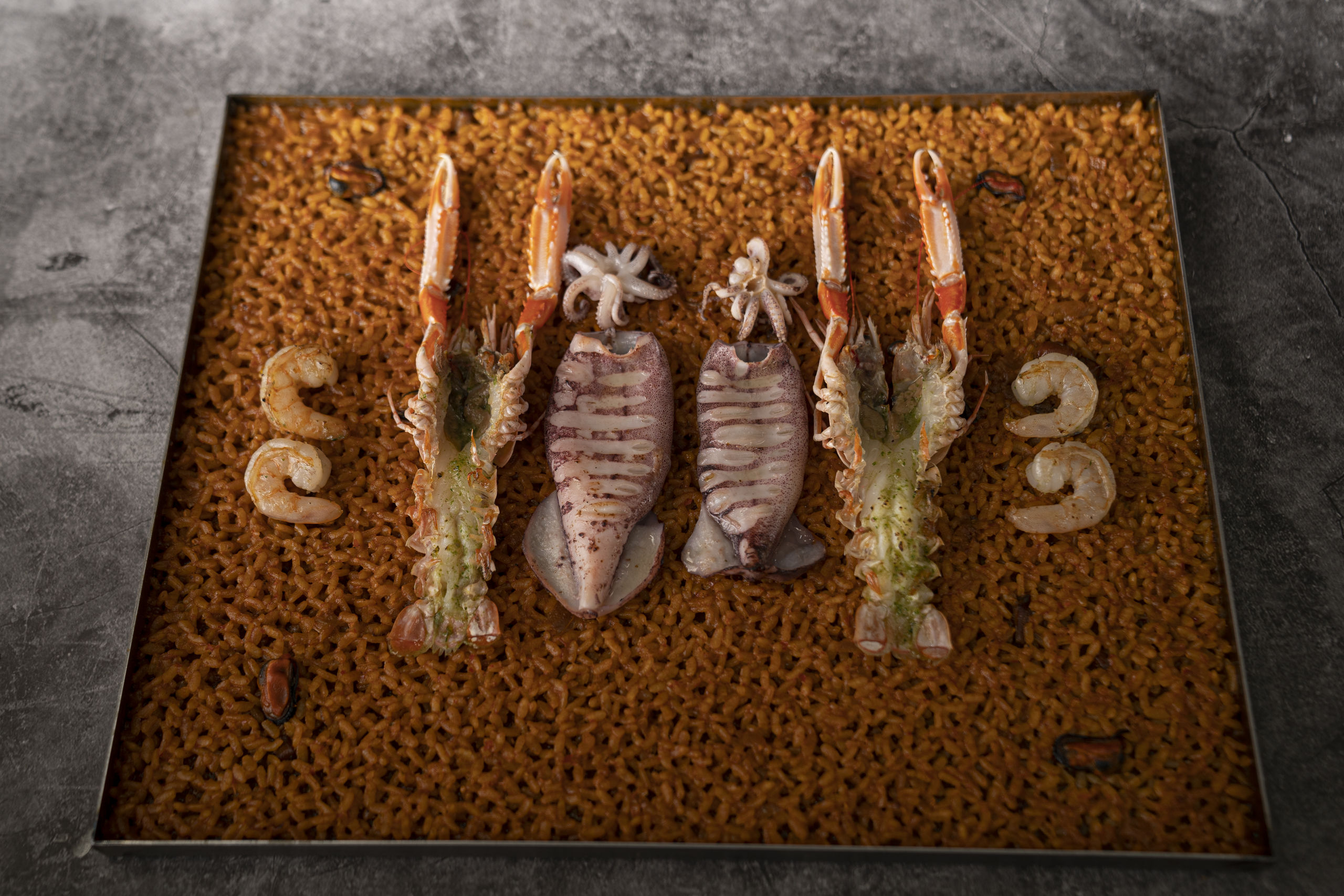 Arroz señoret. Fumé de marisco con chipirones, gambas y cigalas.