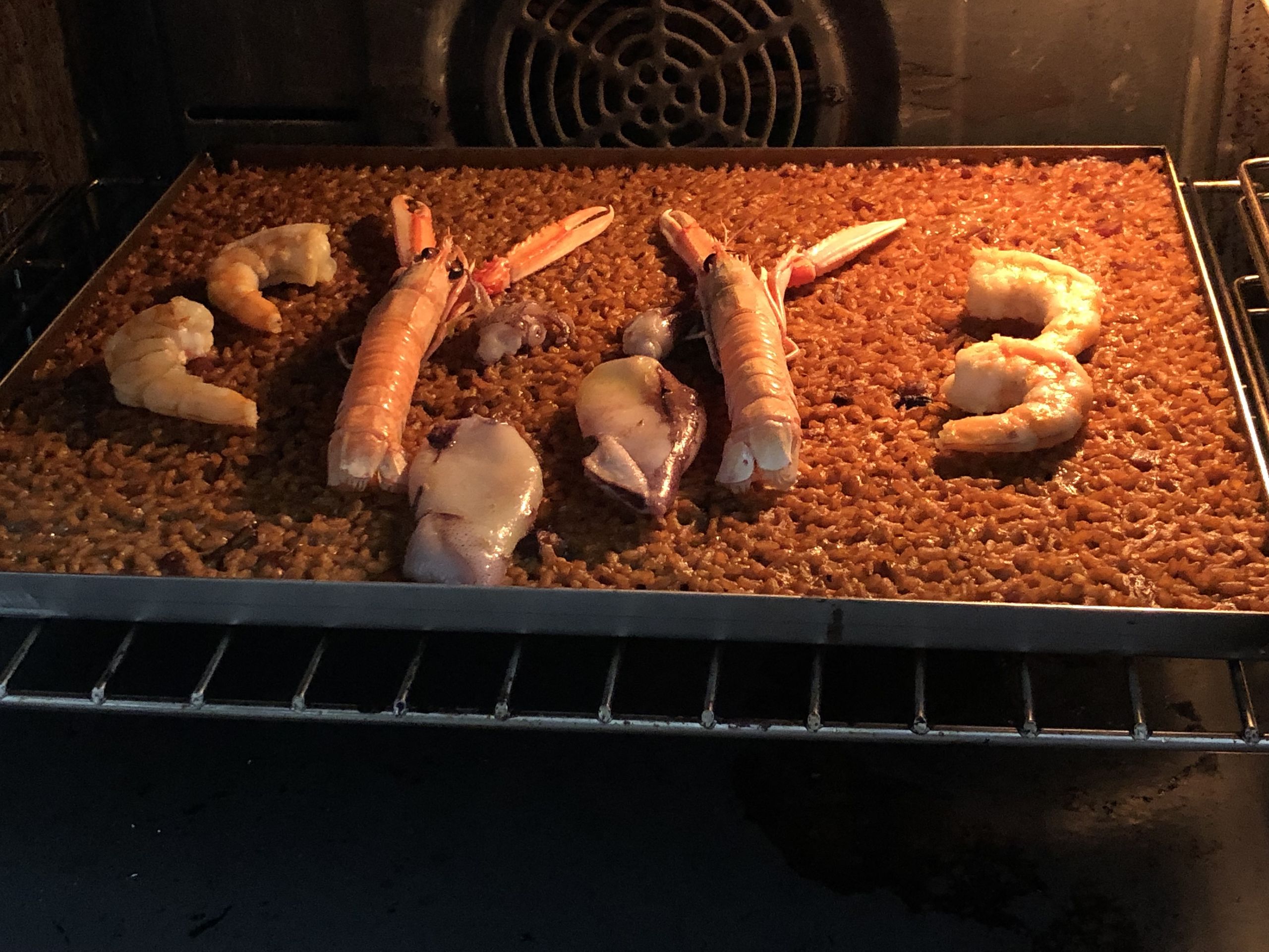 El arroz Señoret en el horno casero para darle el último golpe de cocción.