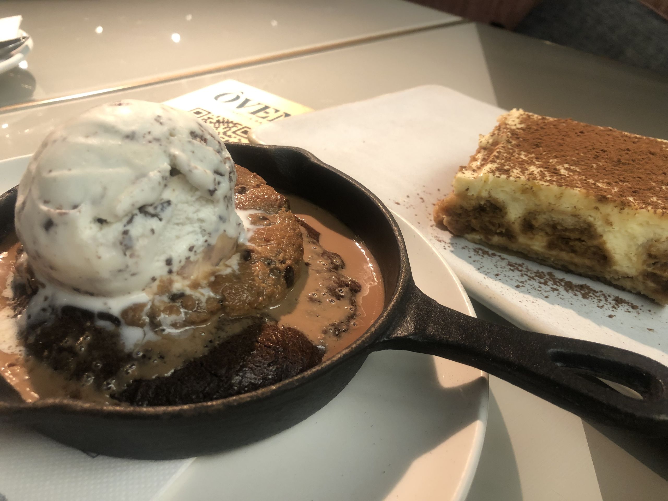 Tiramisú casero y biscotti, crujiente galleta de chocolate horneada y helado de stracciatella.