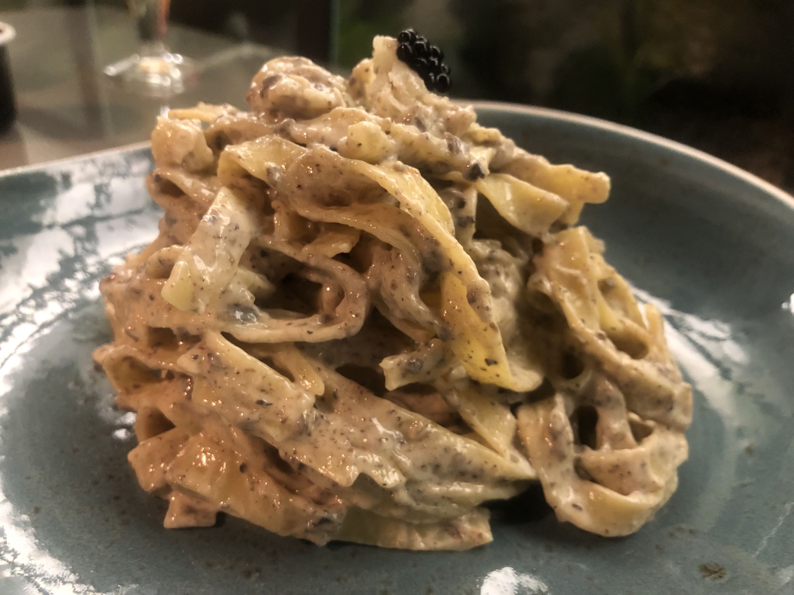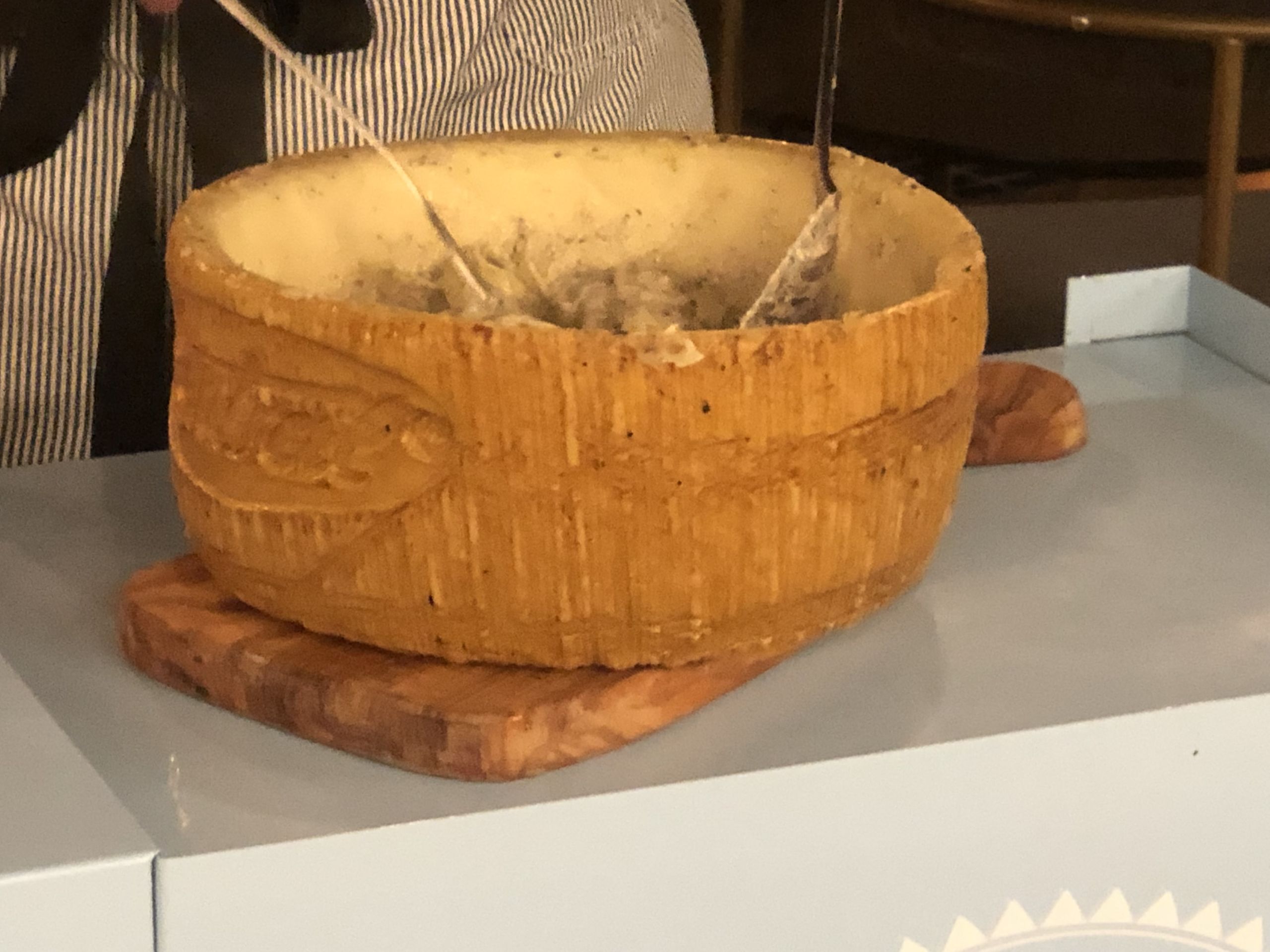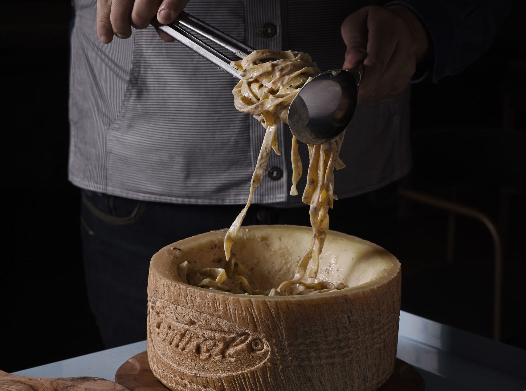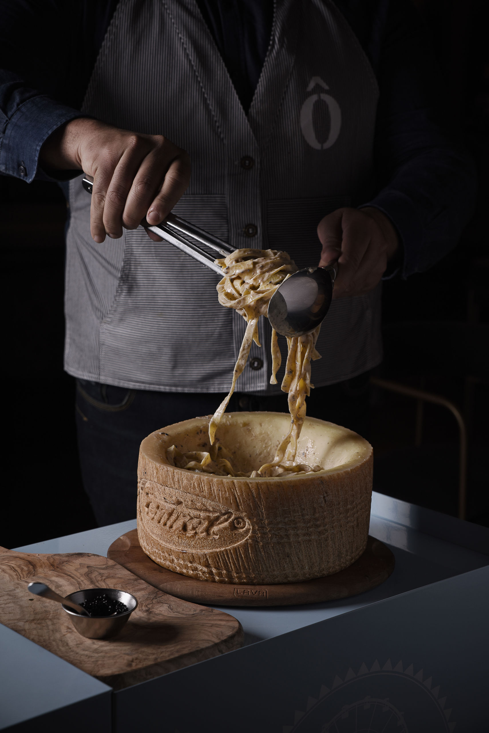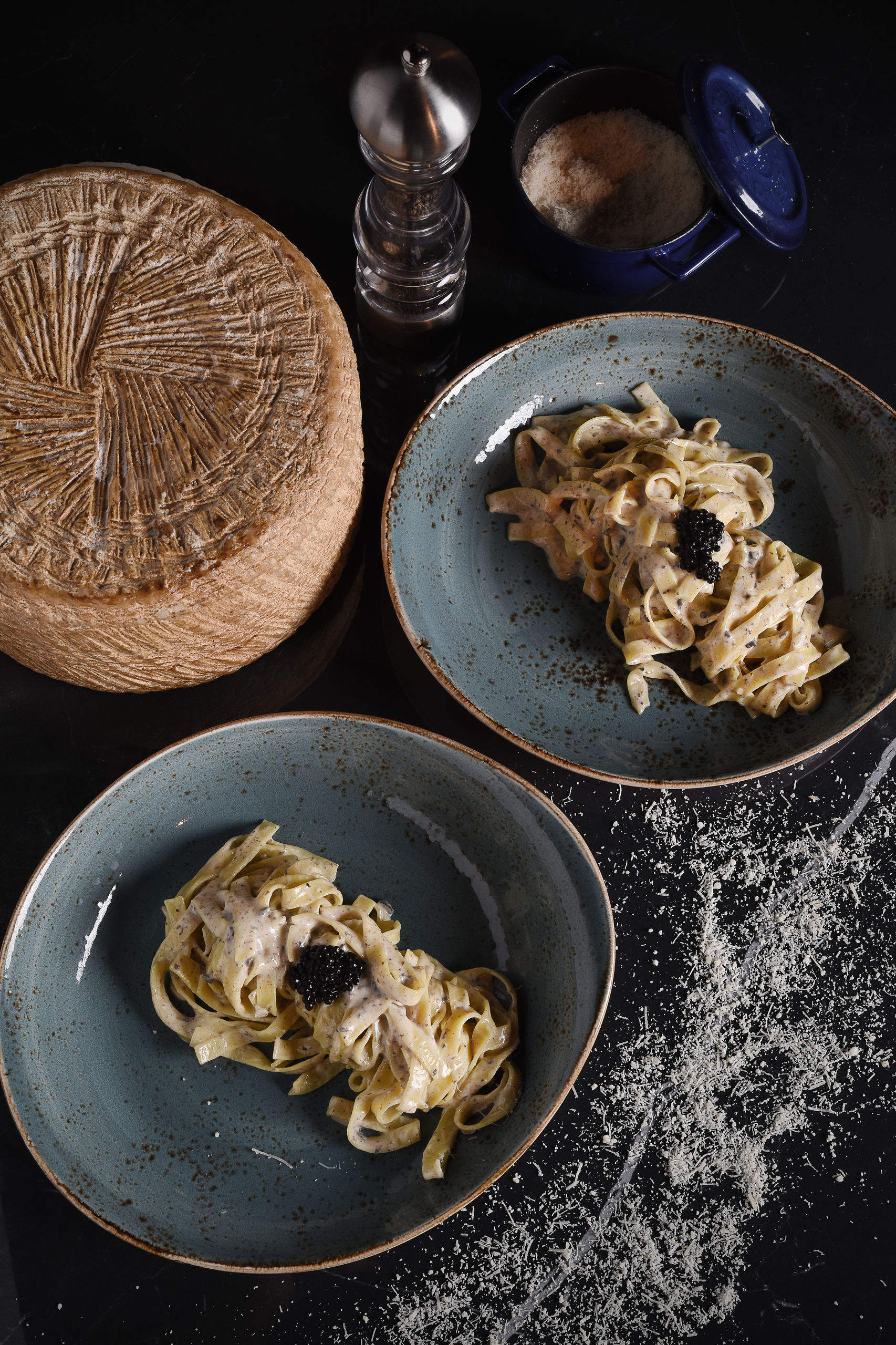 Tagliatelle alla rueda de Pecorino Romano con trufa y caviar.