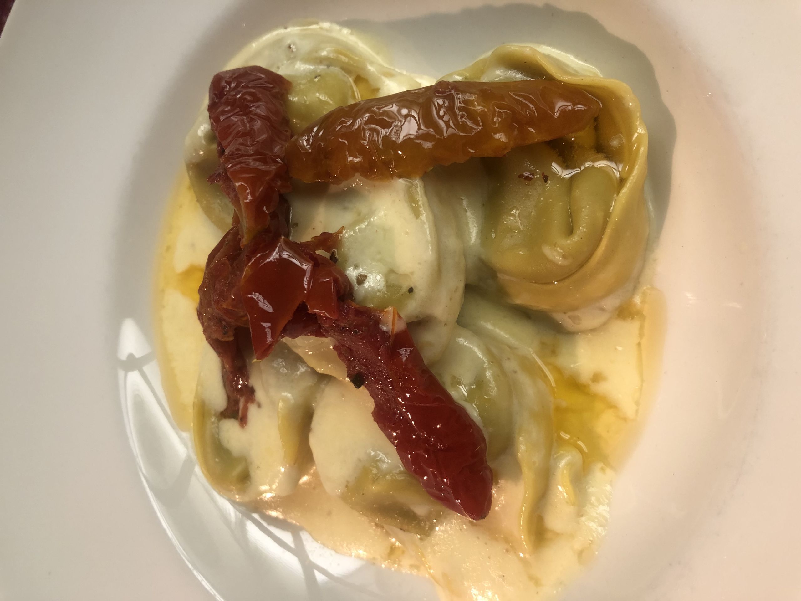 Ravioli de ternera braseada con crema ligera de nata, tomate seco dulce y parmegiano Reggiano.