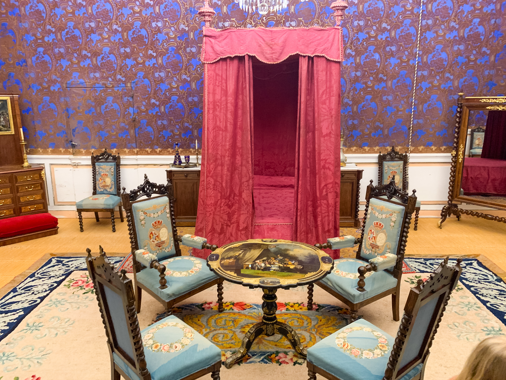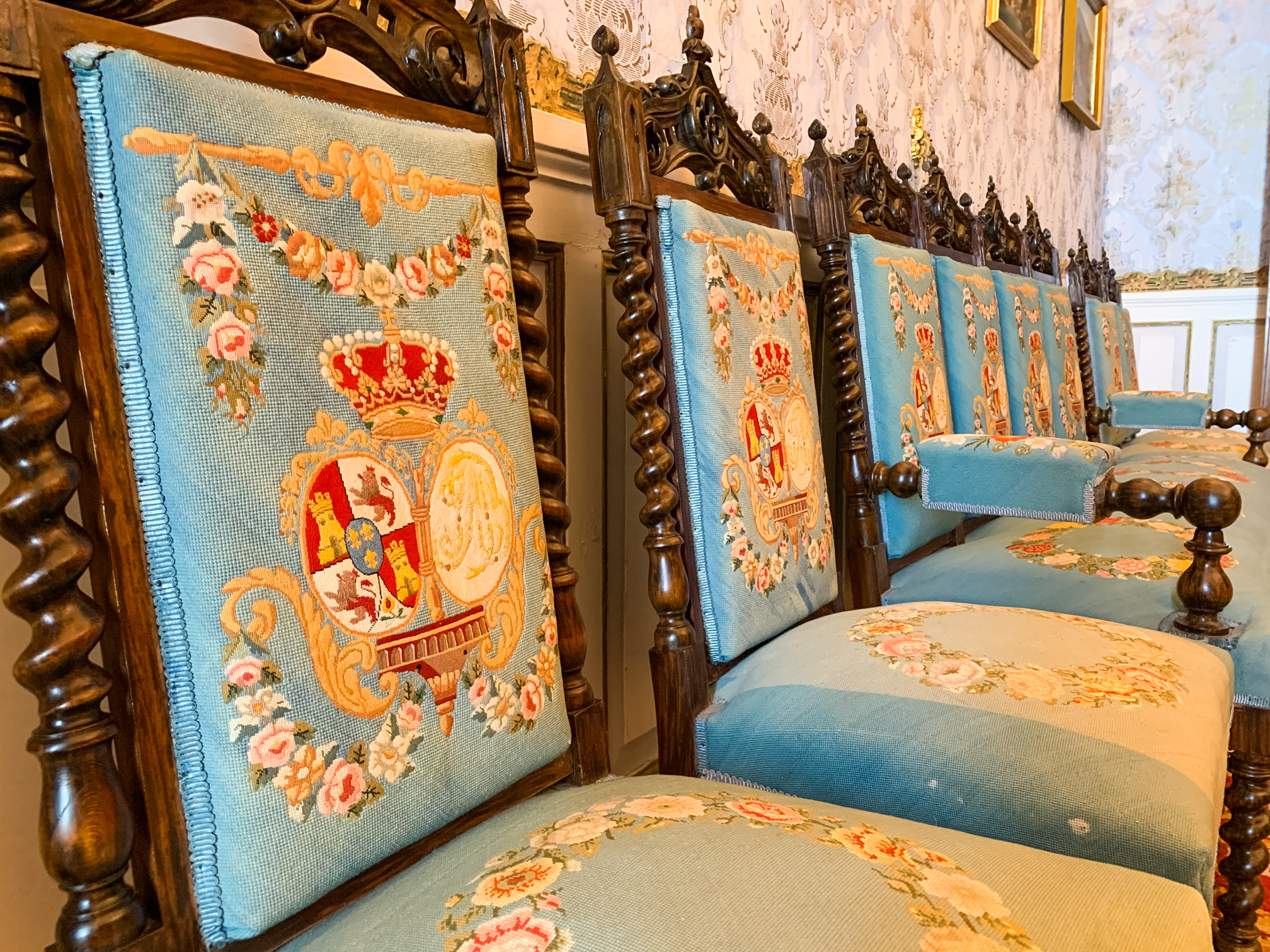 Otro detalle del mobiliario real de la época con el motivos y escudos reales bordados en algunas de sus butacas.