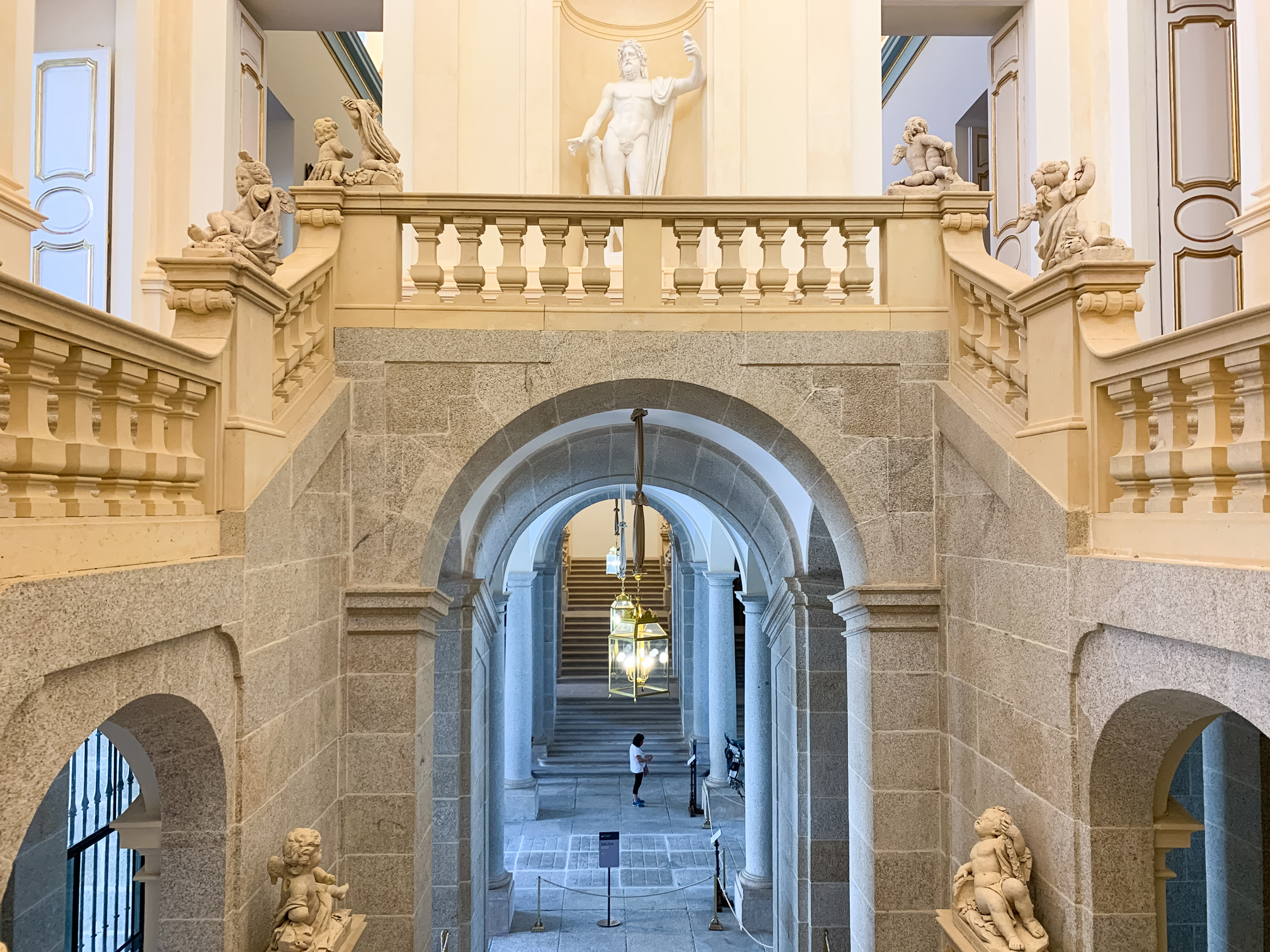 Tras atravesar el patio principal se sube por unas escaleras de granito de mediados del XVIII decoradas con esculturas que son una alegoría al arte, las ciencias, la caza, pesca y la agricultura.