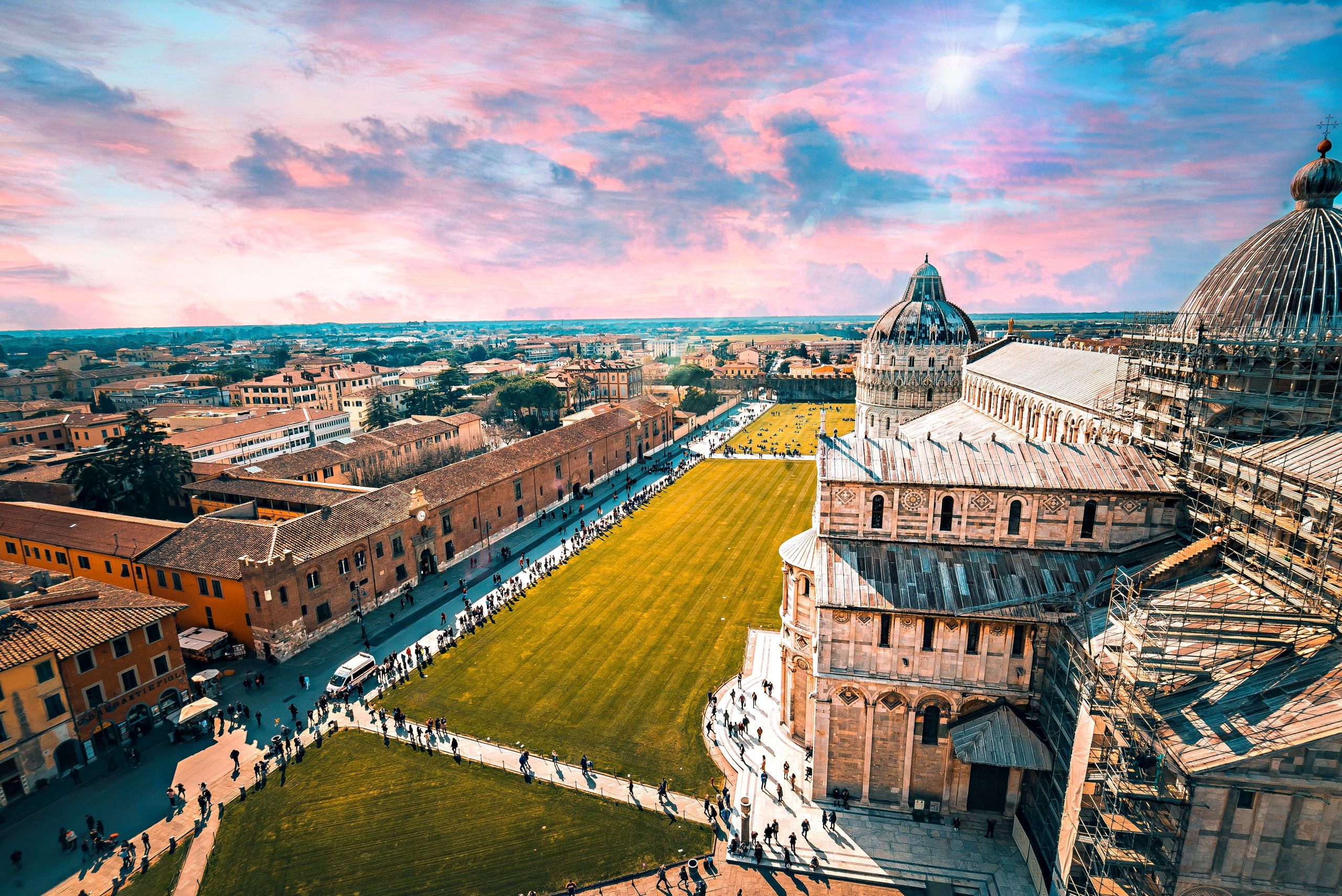 La pequeña ciudad de Pisa se puede visitar desde Florencia en una excursión corta, ya que está a 85 kilómetros al oeste, lo que llevará algo menos de hora y media en coche. La plaza de los Milagros es uno de sus rincones más famosos, una enorme pradera verde sobre la que se extiende el impresionante conjunto monumental cuyo centro es la catedral Duomo, aunque su más famoso monumento es la torre inclinada.