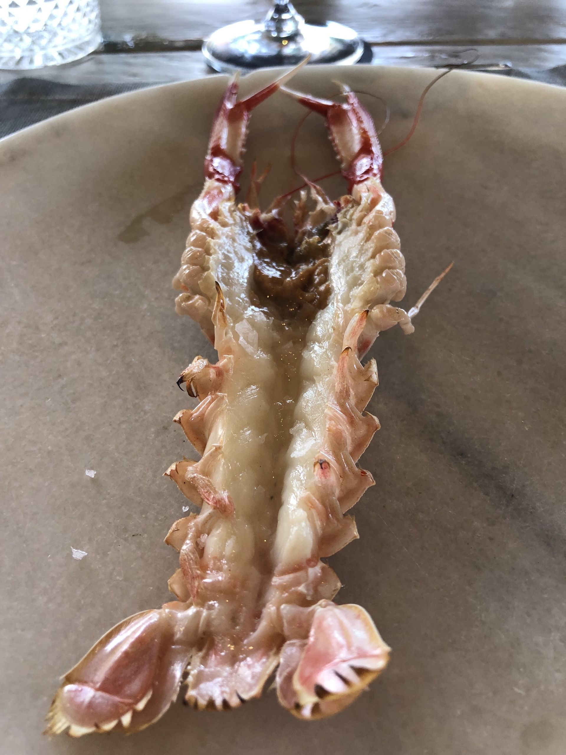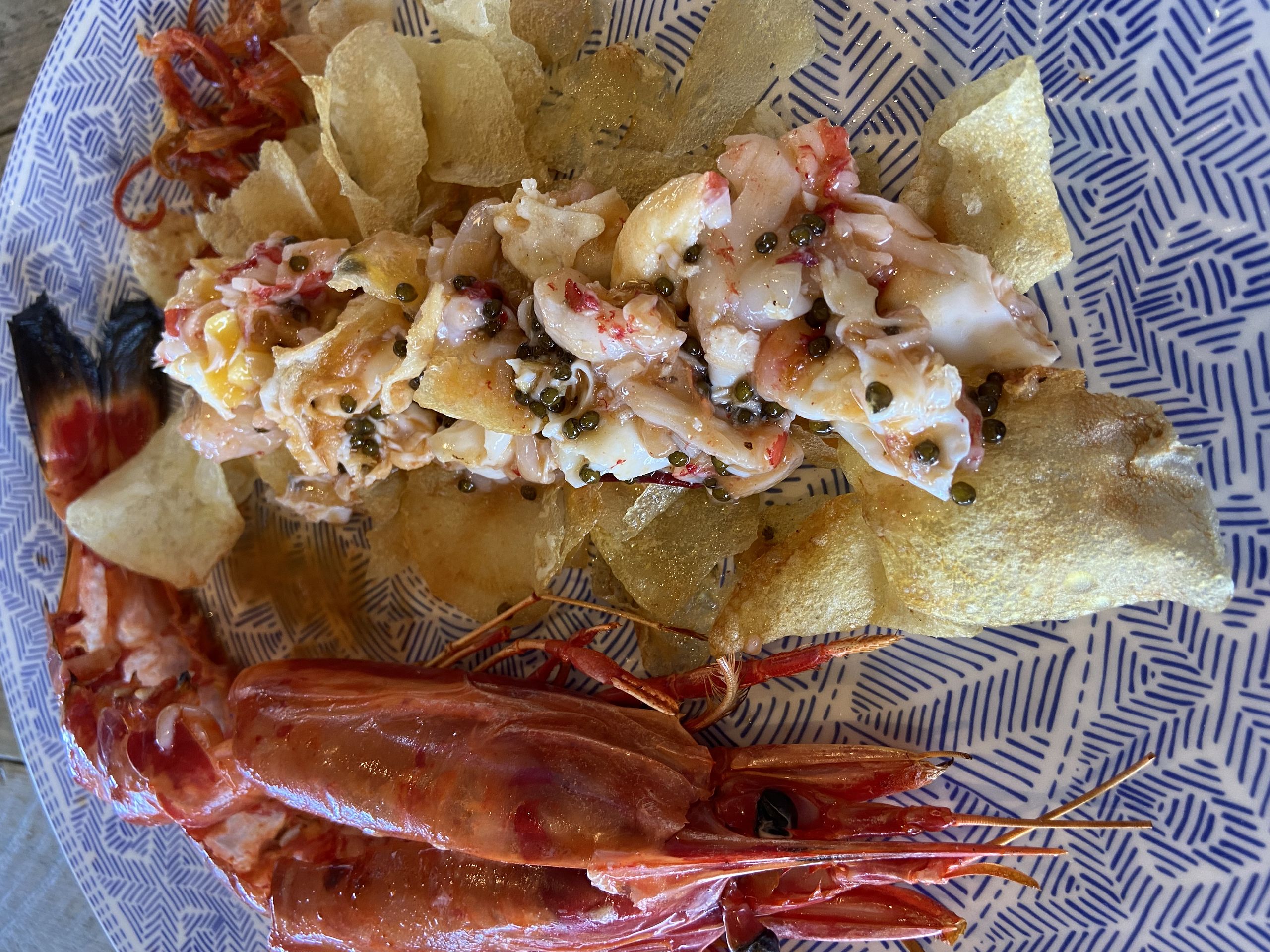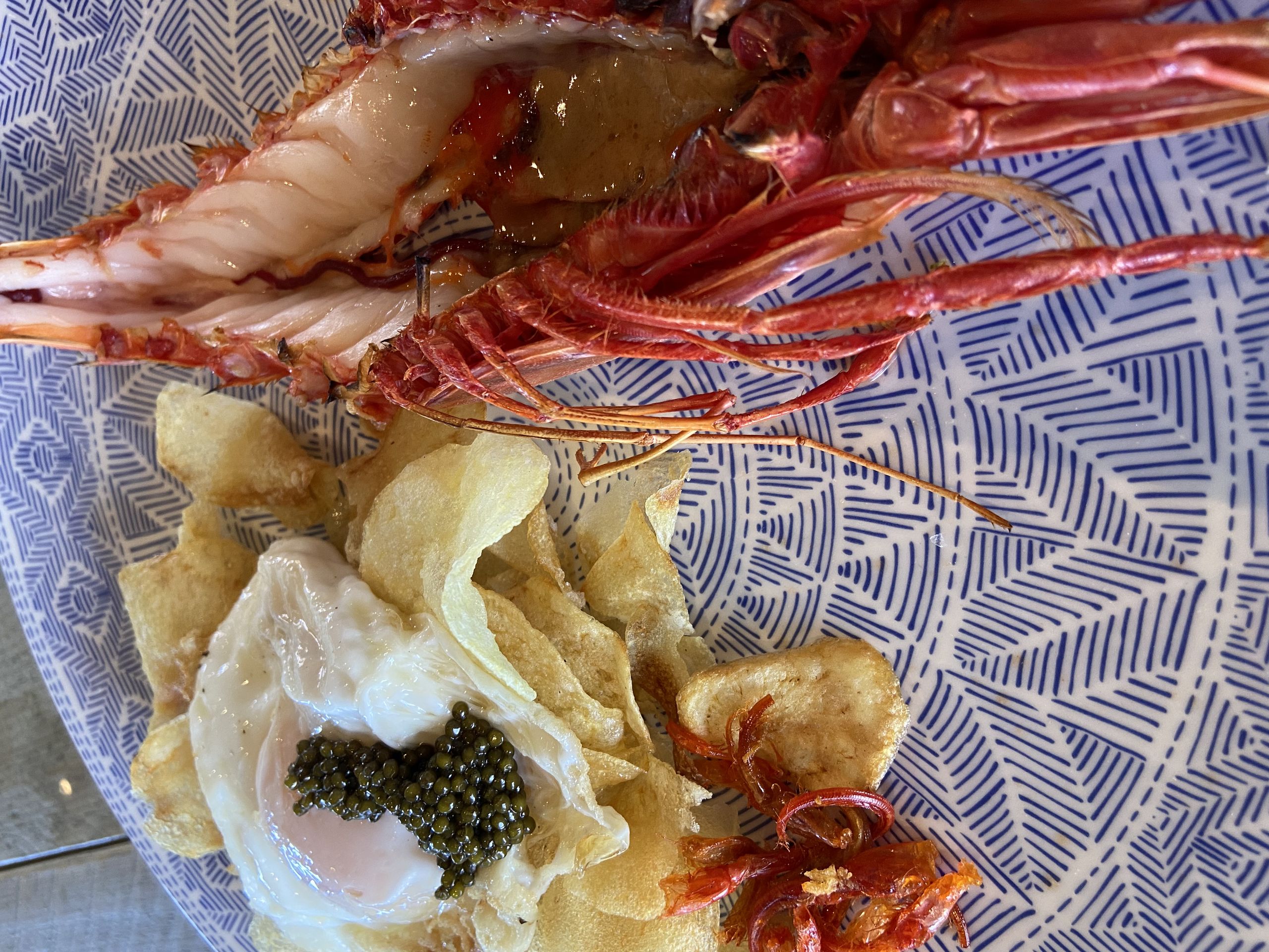 Un clásico de La Milla, el carabinero a la brasa, patatas chips, huevo frito y caviar, antes de emplatarlo.