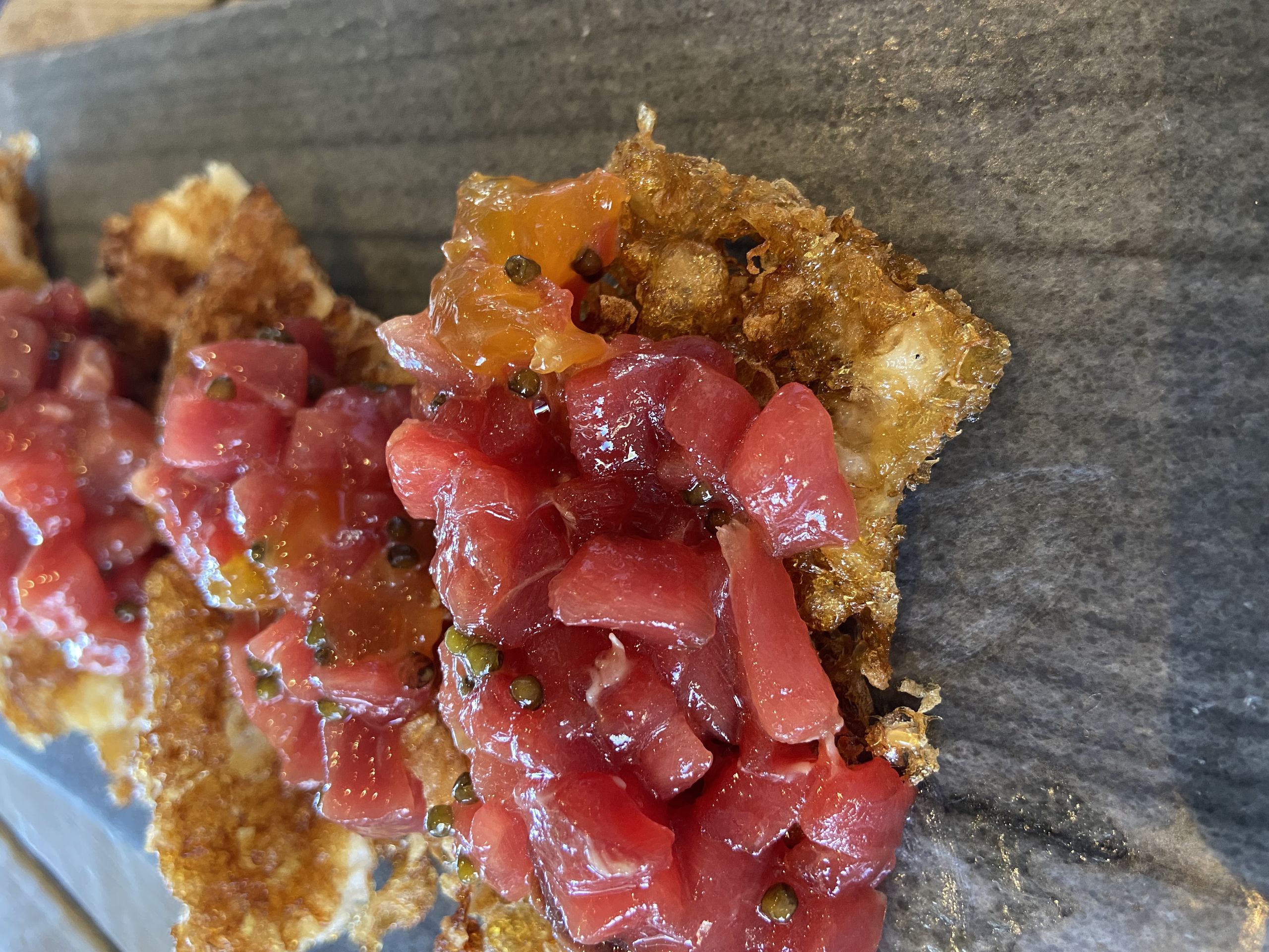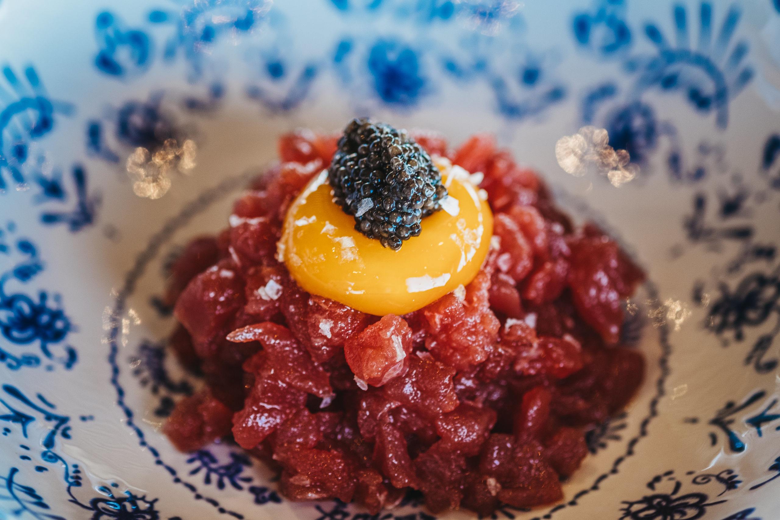 Tartar de atún rojo con yema curada en soja, acompañada de su clara frita y caviar.