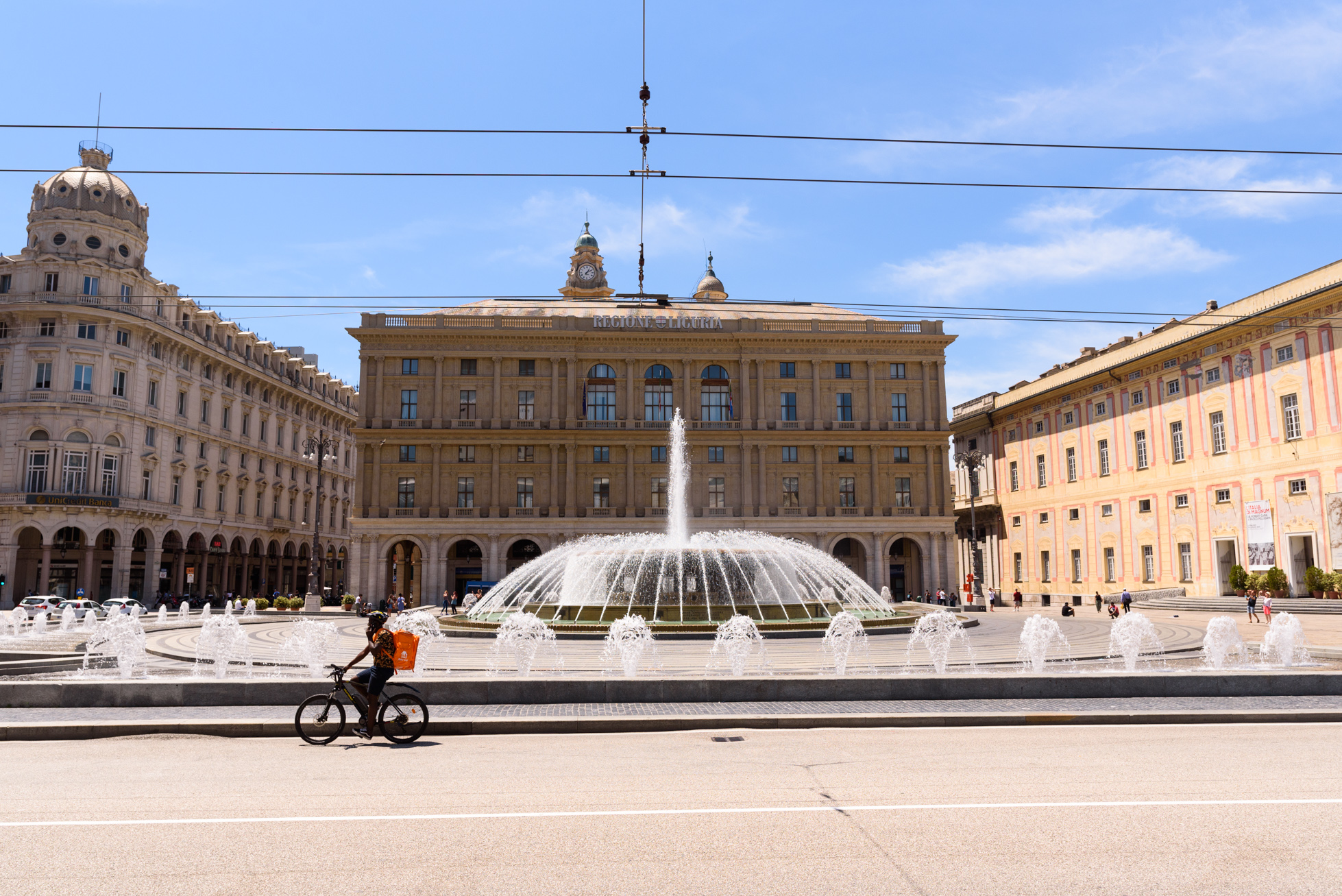 En la Piazza de Ferrari nace la Via XX Settembre, la arteria comercial más importante de Génova, flanqueada por monumentales palacios.