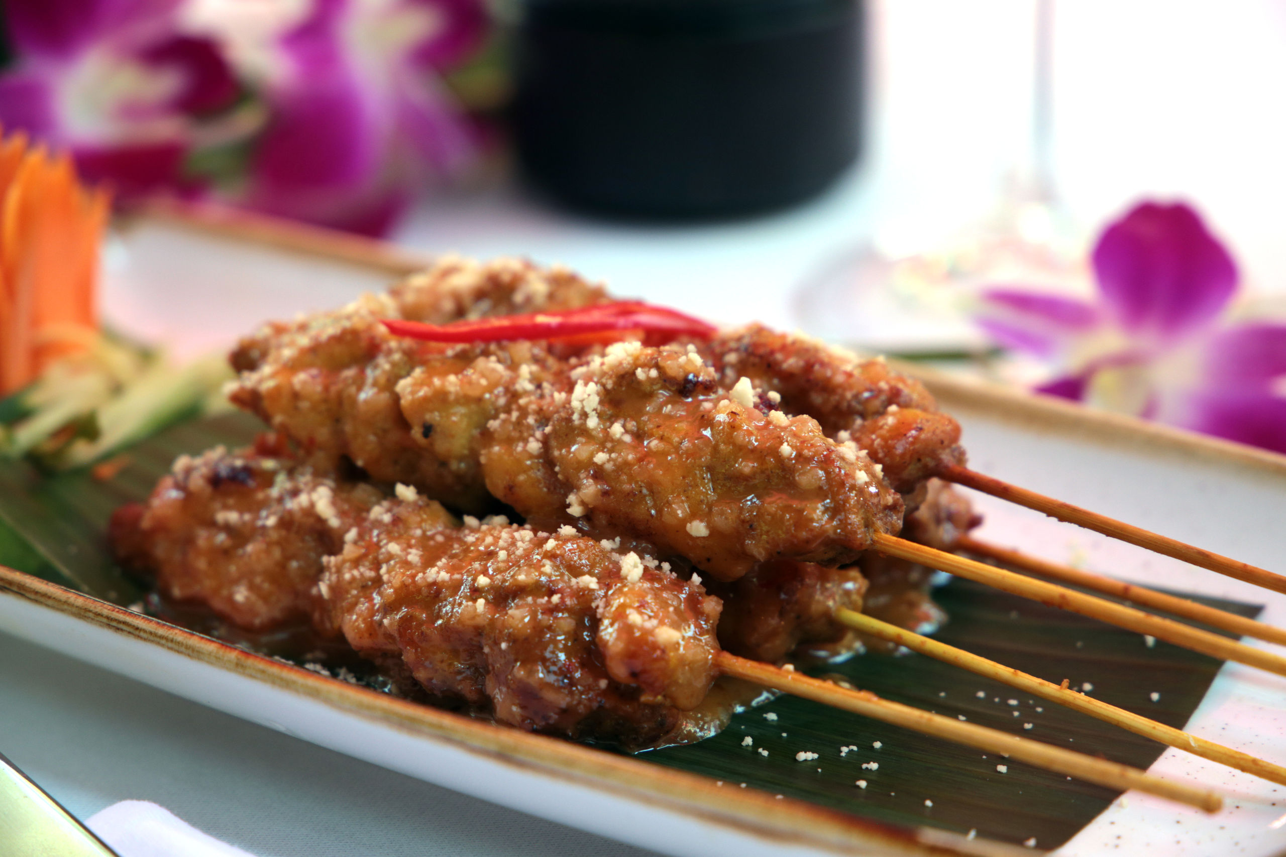 Kai satee, finas brochetas de pollo marinado en leche de coco y hierbas con salsa de cacahuetes.