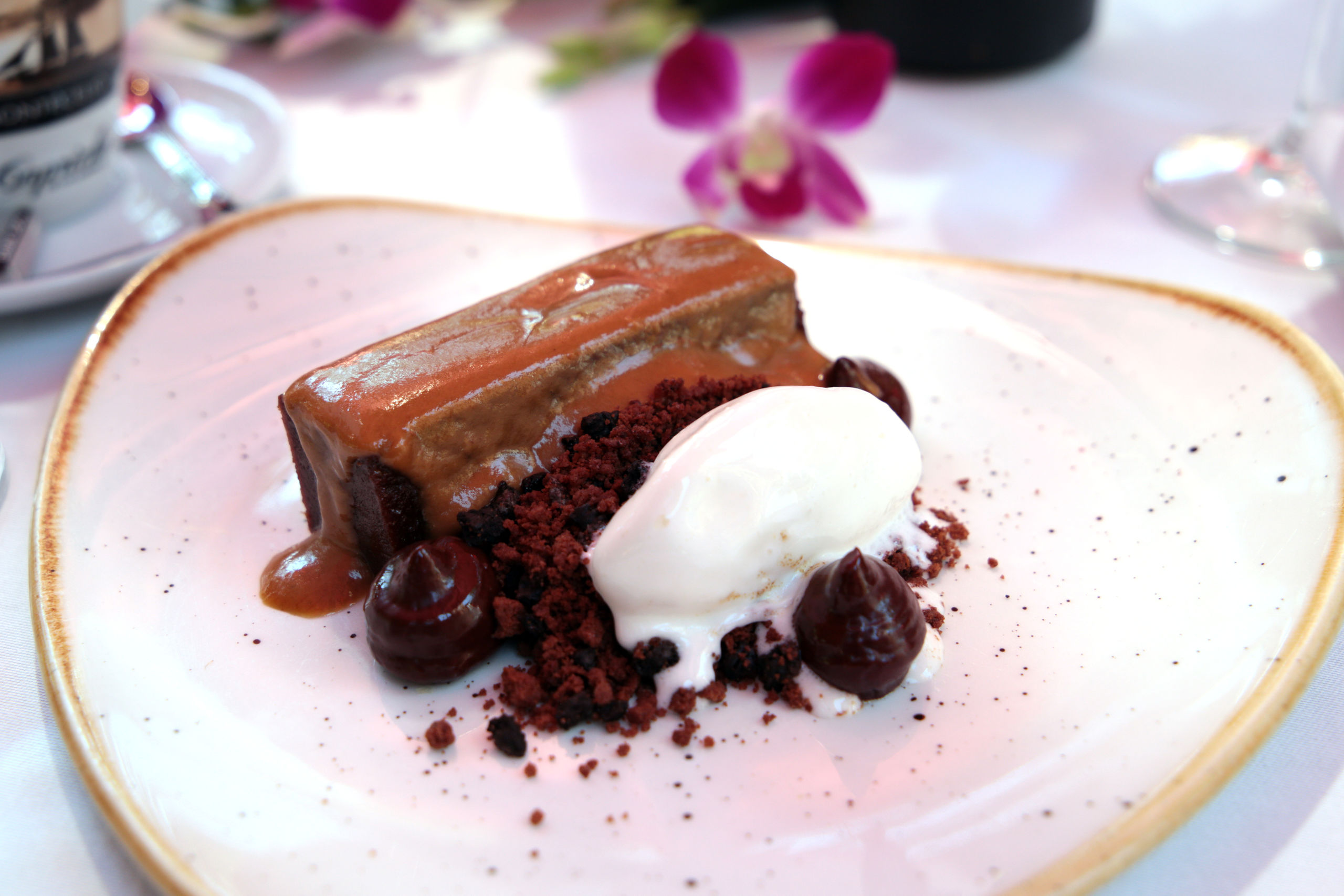 Brownie acompañado con salsa de caramelo y helado de leche de coco.