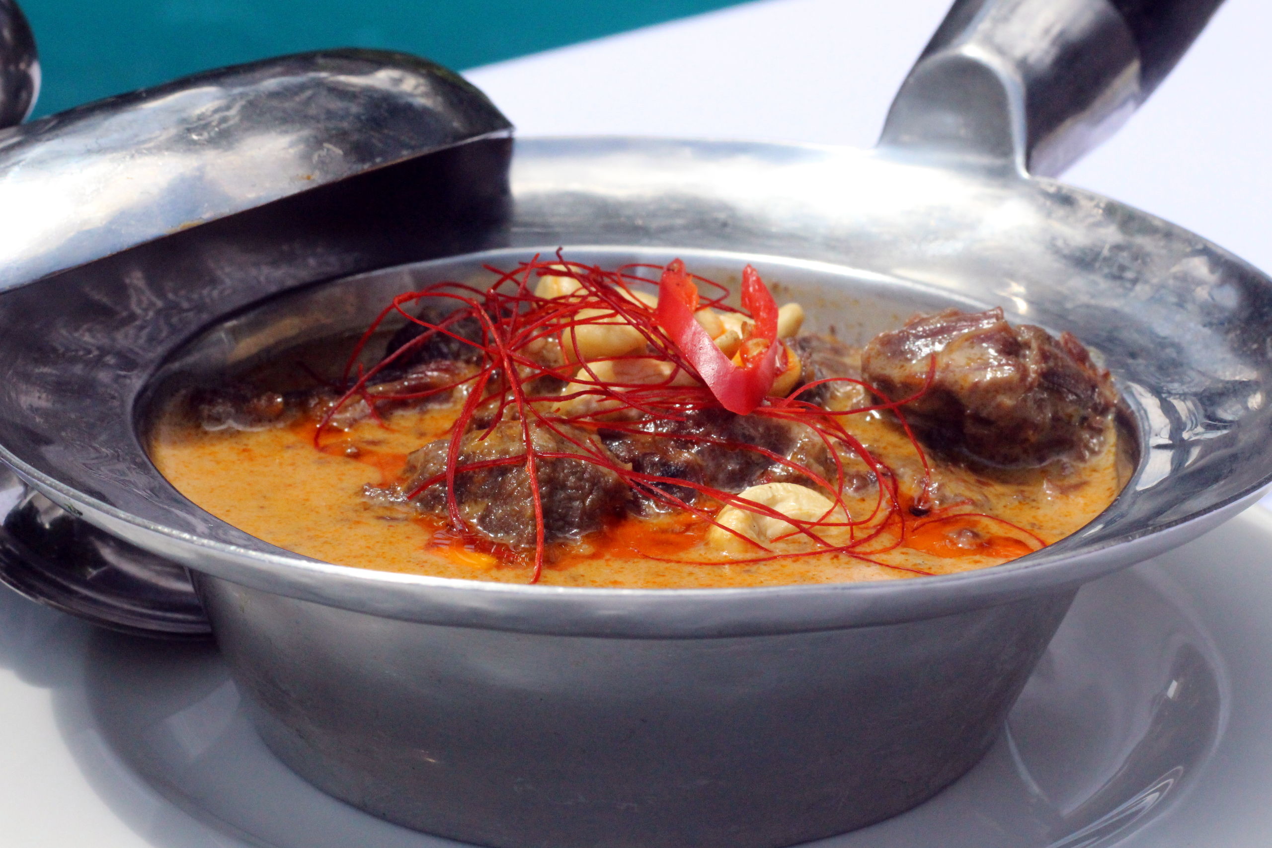 Massaman thai, carne de vacuno al curry rojo suave y untuoso, con patatas y anacardos.