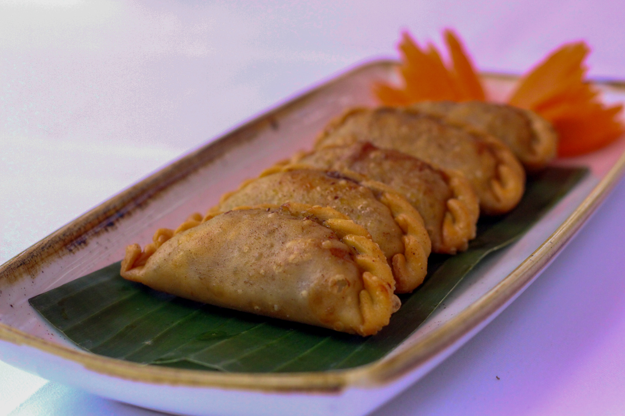 Karee pab, empanada de pasta crujiente, rellena de verduras al curry amarillo y solomillo de ternera picada.