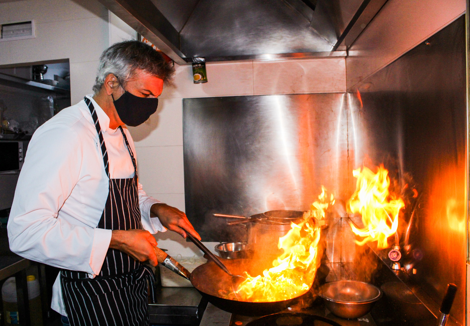 El chef Juan, en los fogones de Thai Arturo Soria preparando un wok.