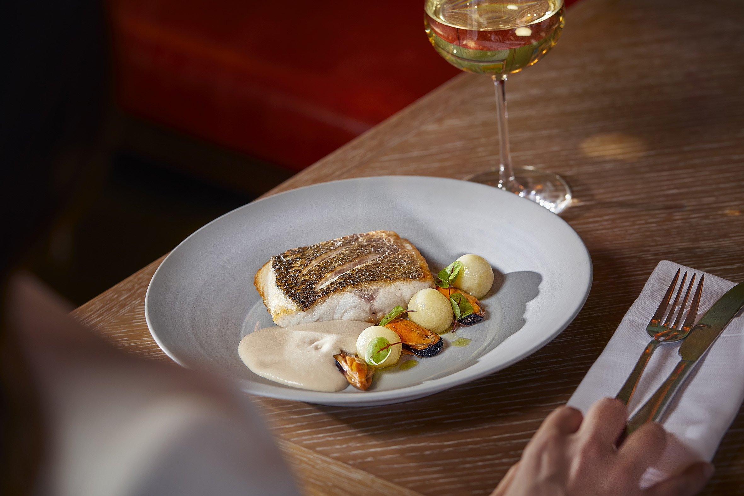 Lubina salvaje con crema de hinojo, patata y mejillón de roca.