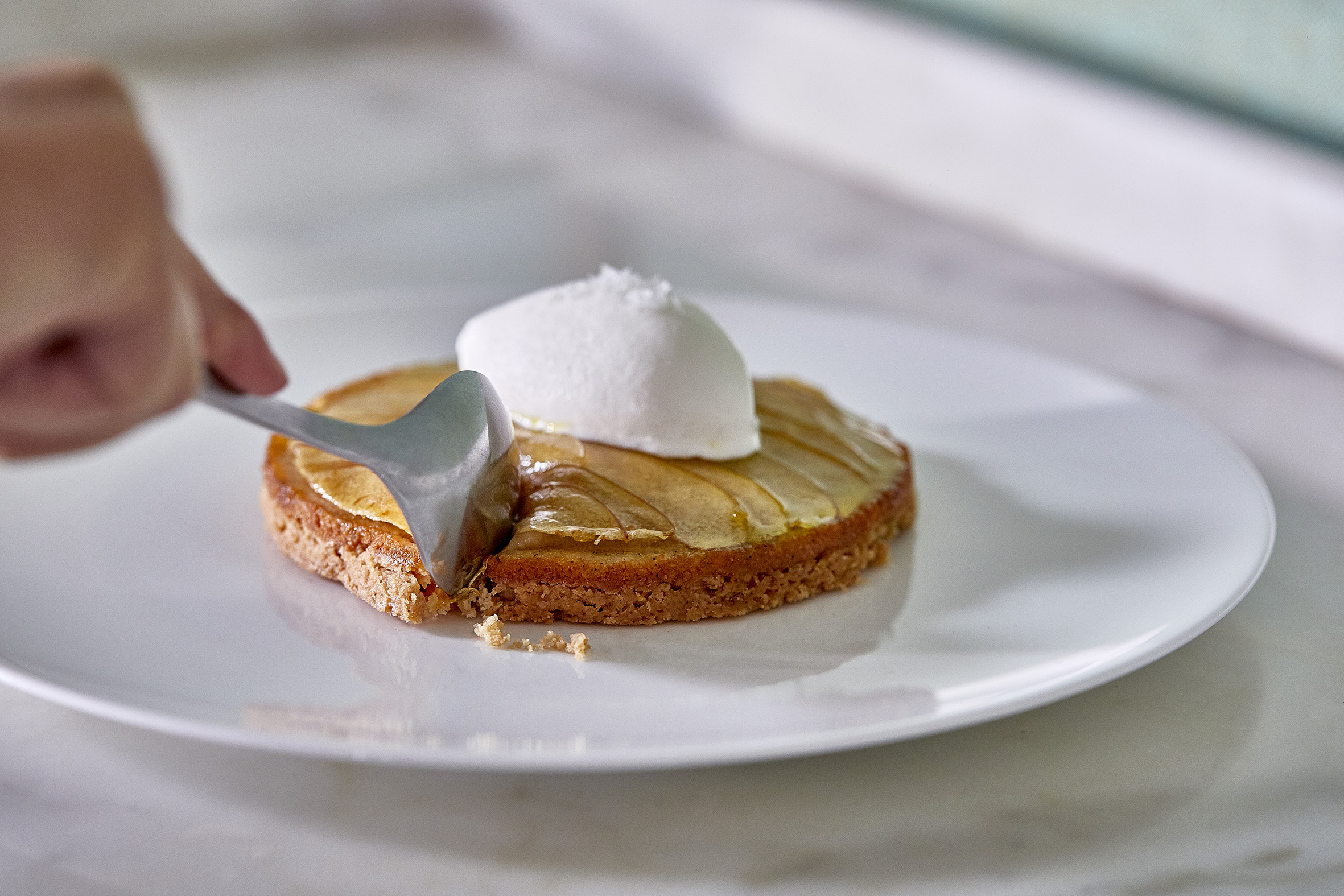 Tarta de manzana con crema de almendra y amarula, vainilla y helado de yogur.