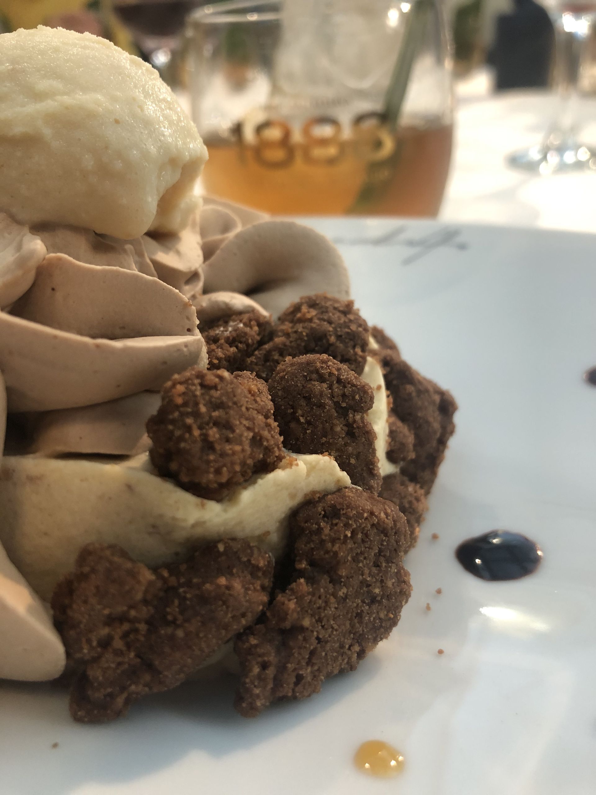 Helado de avellana y ron, y tiramisú de ron Brugal 1888 y pasas.