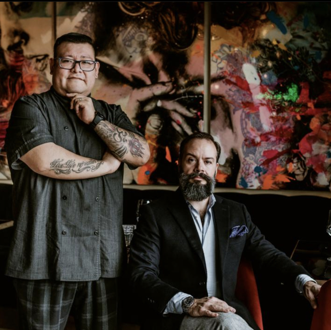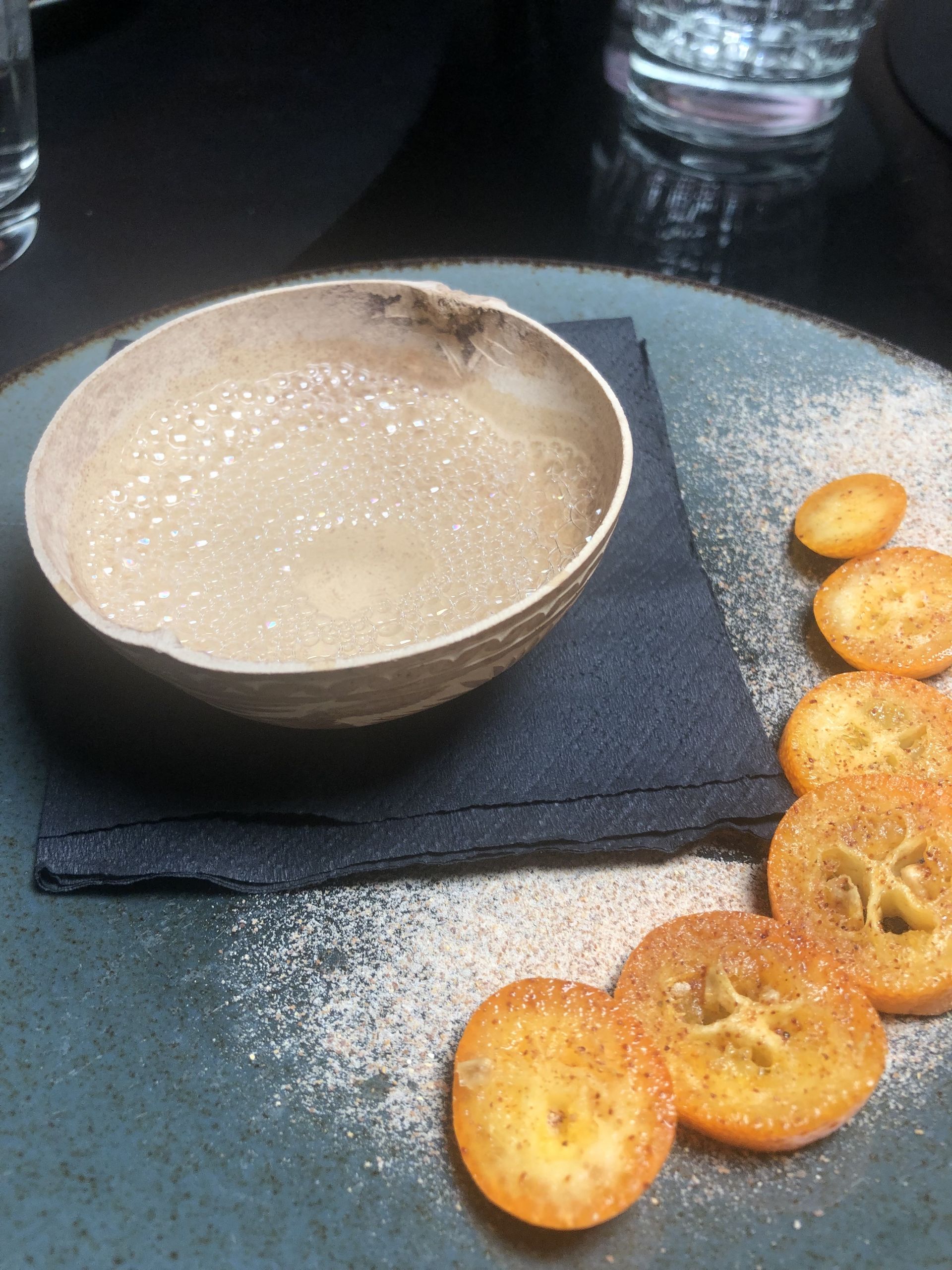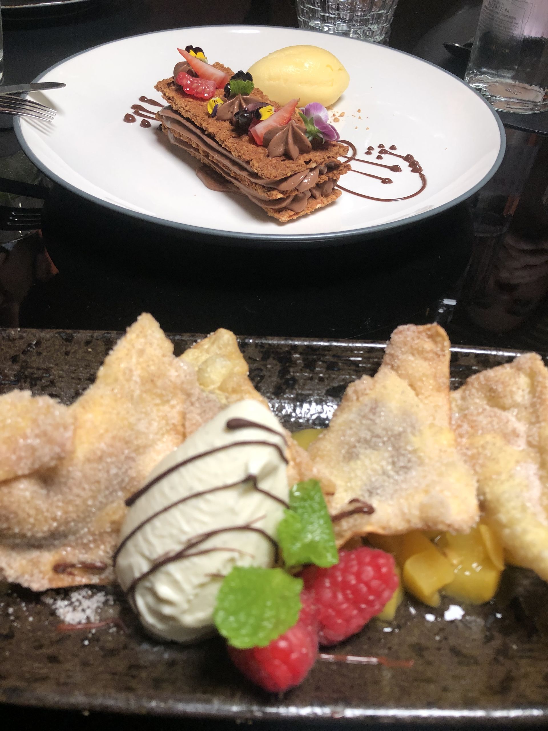 Buñuelitos de crema quemada, rellenos de leche quemada y ate de guayaba, servidos sobre una compota de melocotón y helado de vainilla. Milhojas de mazapán y chocolate chiapaneco acompañado con sorbete de mandarina.