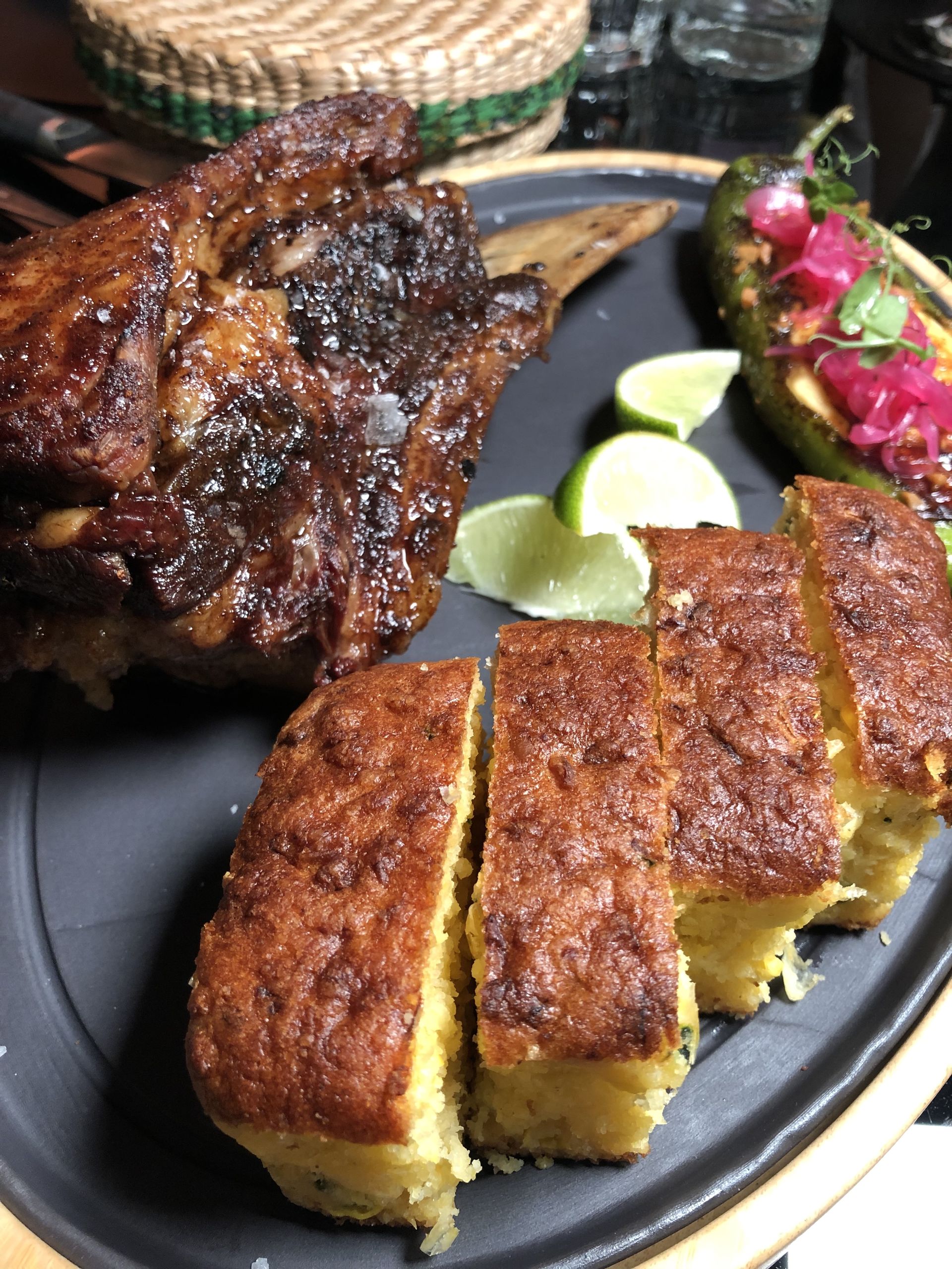 Asado Regio de Costilla de Vaca cocinada a baja temperatura y terminada a la brasa con chile relleno de queso y pan de maíz.