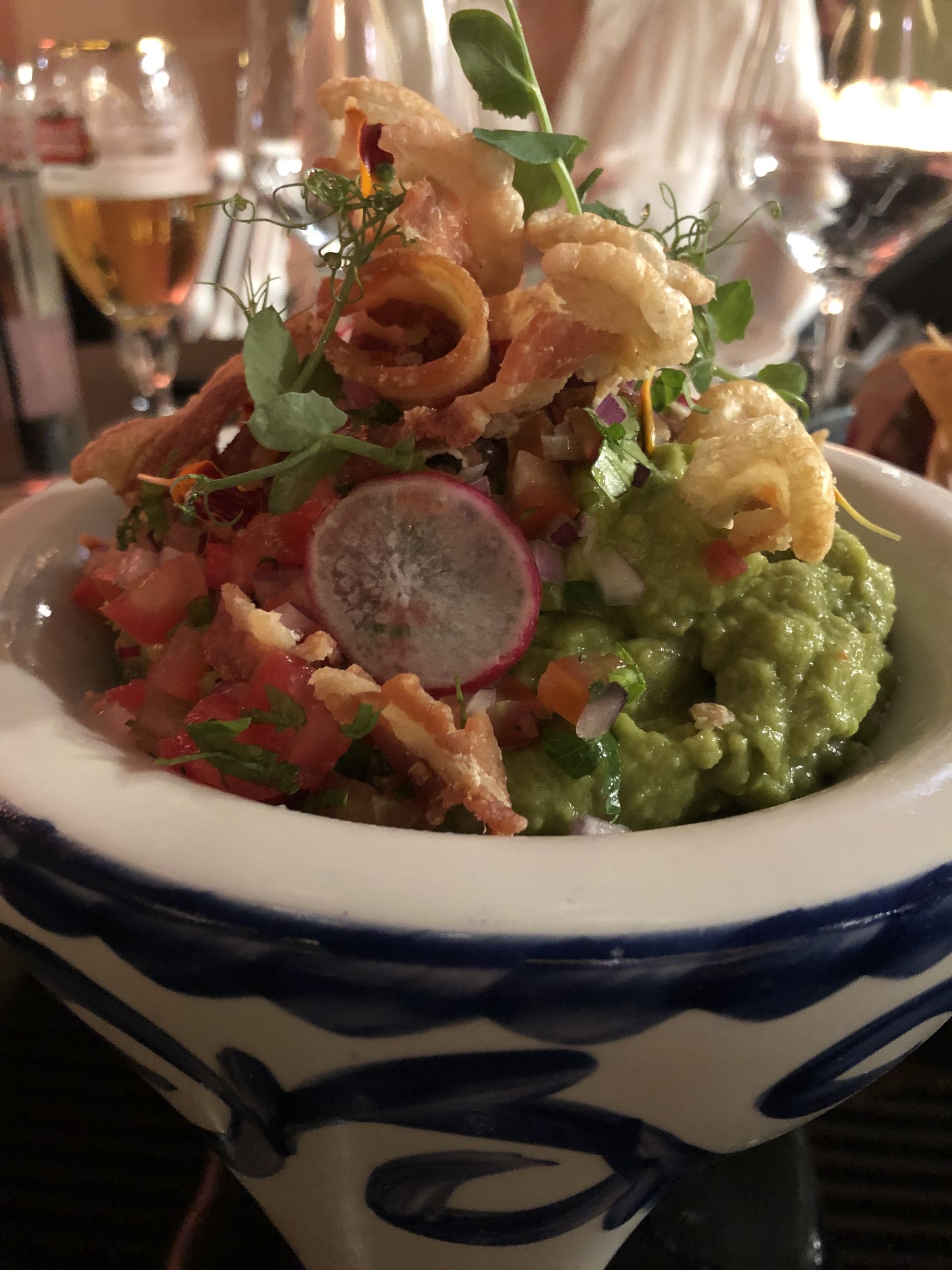 Guacamole de Molcajete machacado en mortero de piedra volcánica, con torreznos, zumo de lima, tomate, chile verde fresco y cilantro, servido con totopos de maíz.