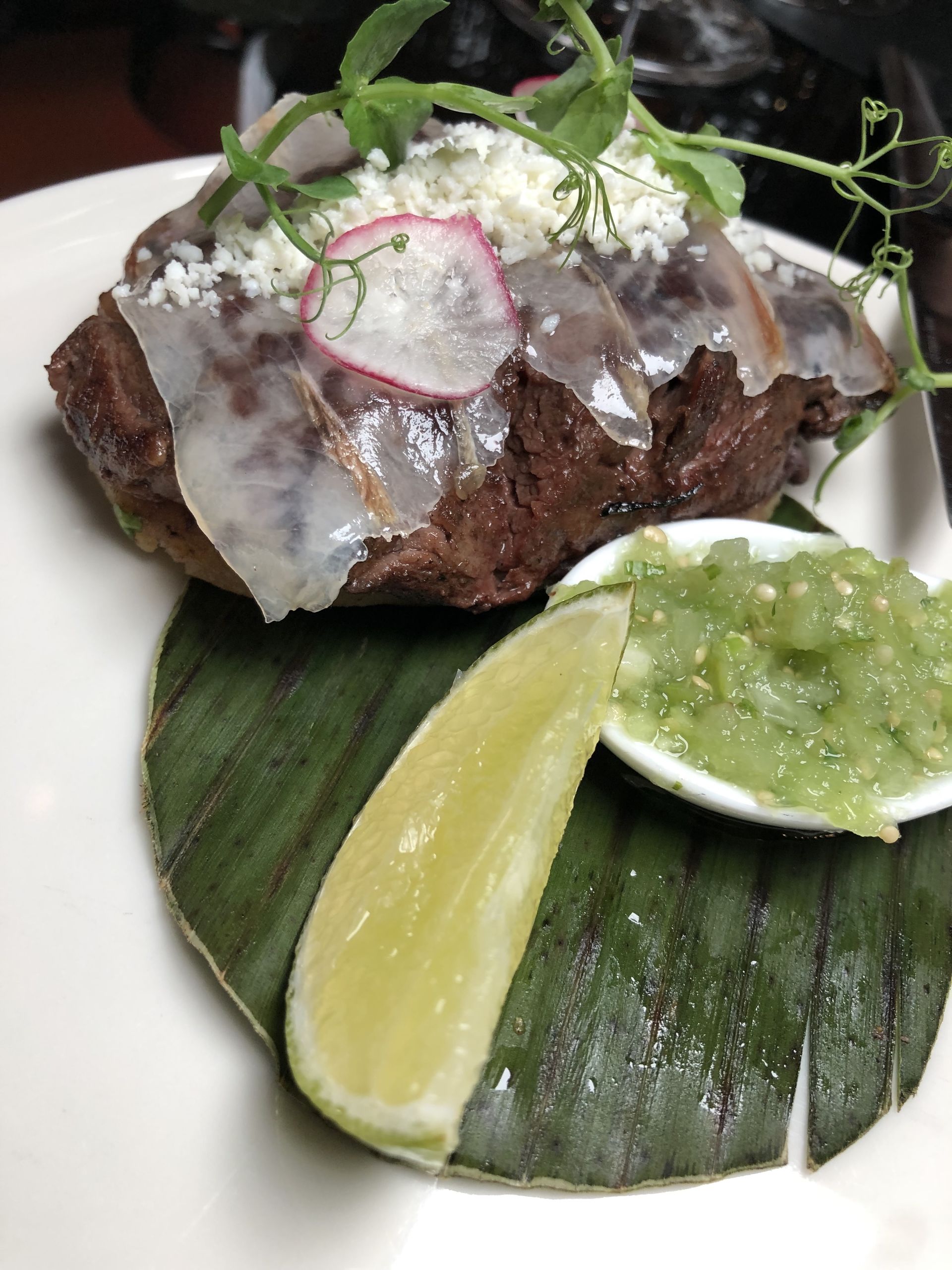 Sopecitos de entrecot y velo Ibérico: masa de maíz, frijoles refritos, entrecot a la brasa, fina lámina de pancetta ibérica, salsa verde cruda y queso fresco.