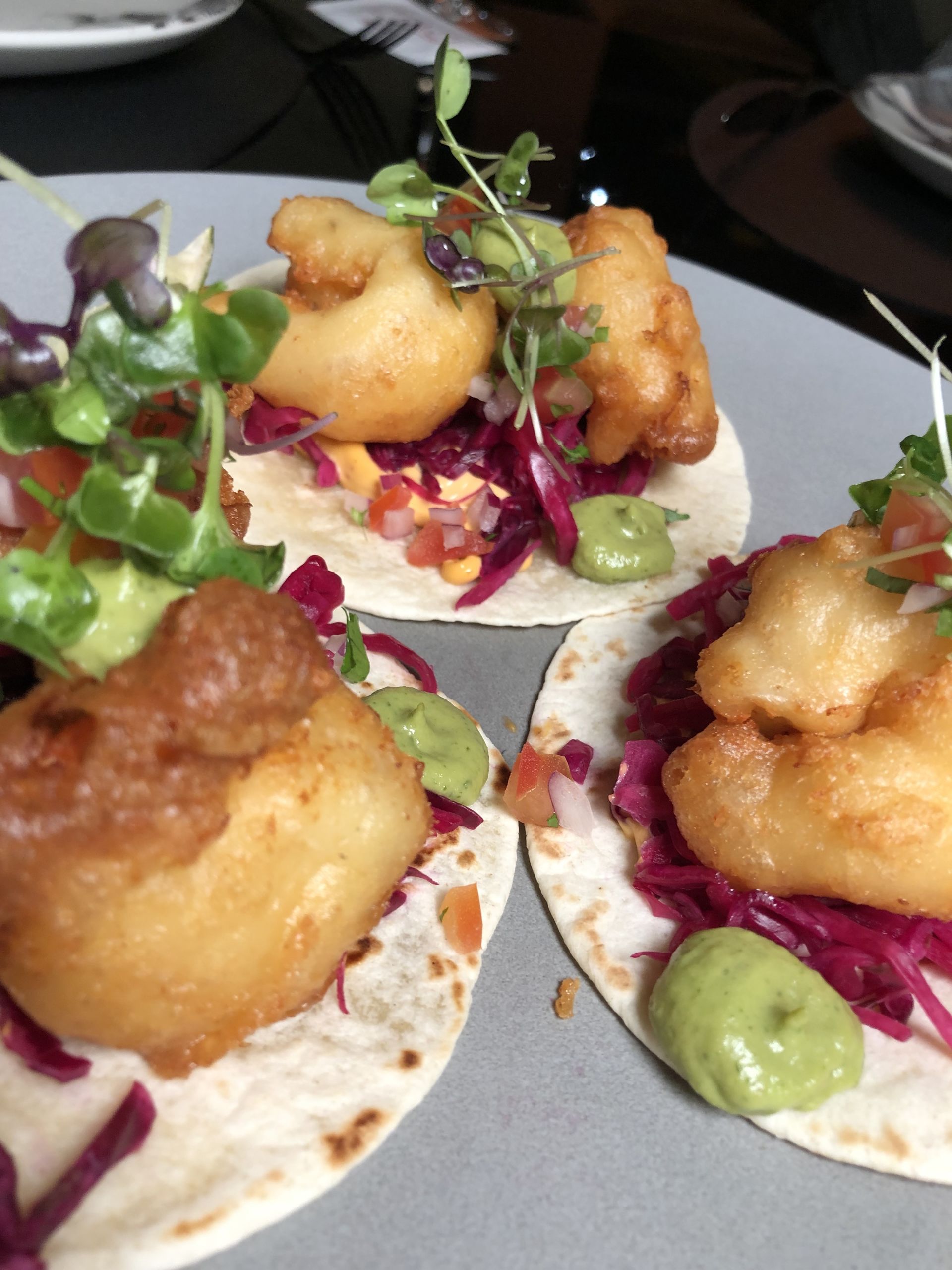 Taco Rosarito: tortilla de trigo, gambón en gabardina de queso Edam, encurtido de lombarda, mayonesa de chipotle, pico de gallo y aguacate.