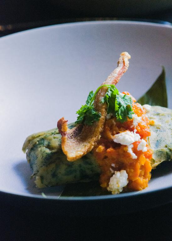 Tamalito de Acelgas y Torreznos: masa de maíz con acelgas envuelta en hoja de plátano, cocida al vapor, servido en chiltomate, queso Cotija y torreznos.