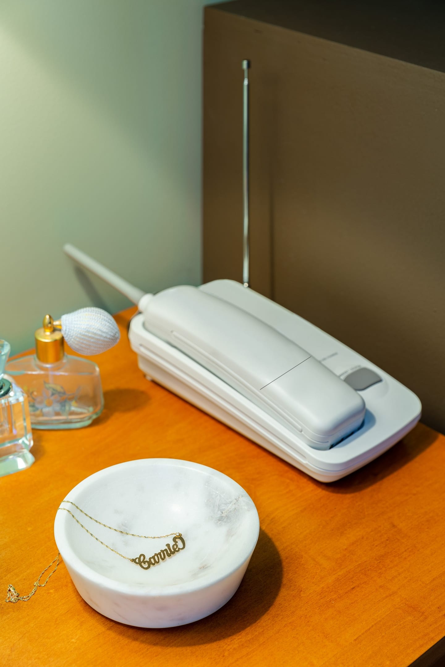 Detalles del apartamento con un teléfono de los años 90 y el colgante con el nombre de Carrie.