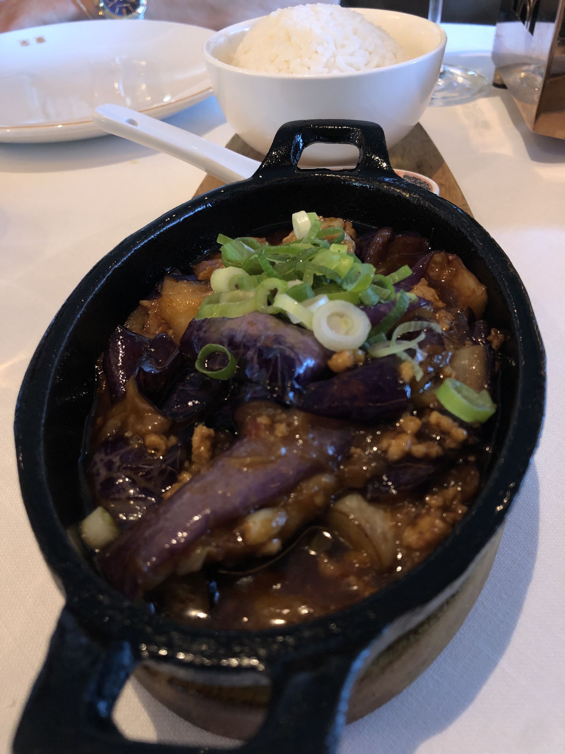 Berenjena cantonesa en salsa, acompañada de arroz blanco con lomo de cerdo picado y miga de bacalao.