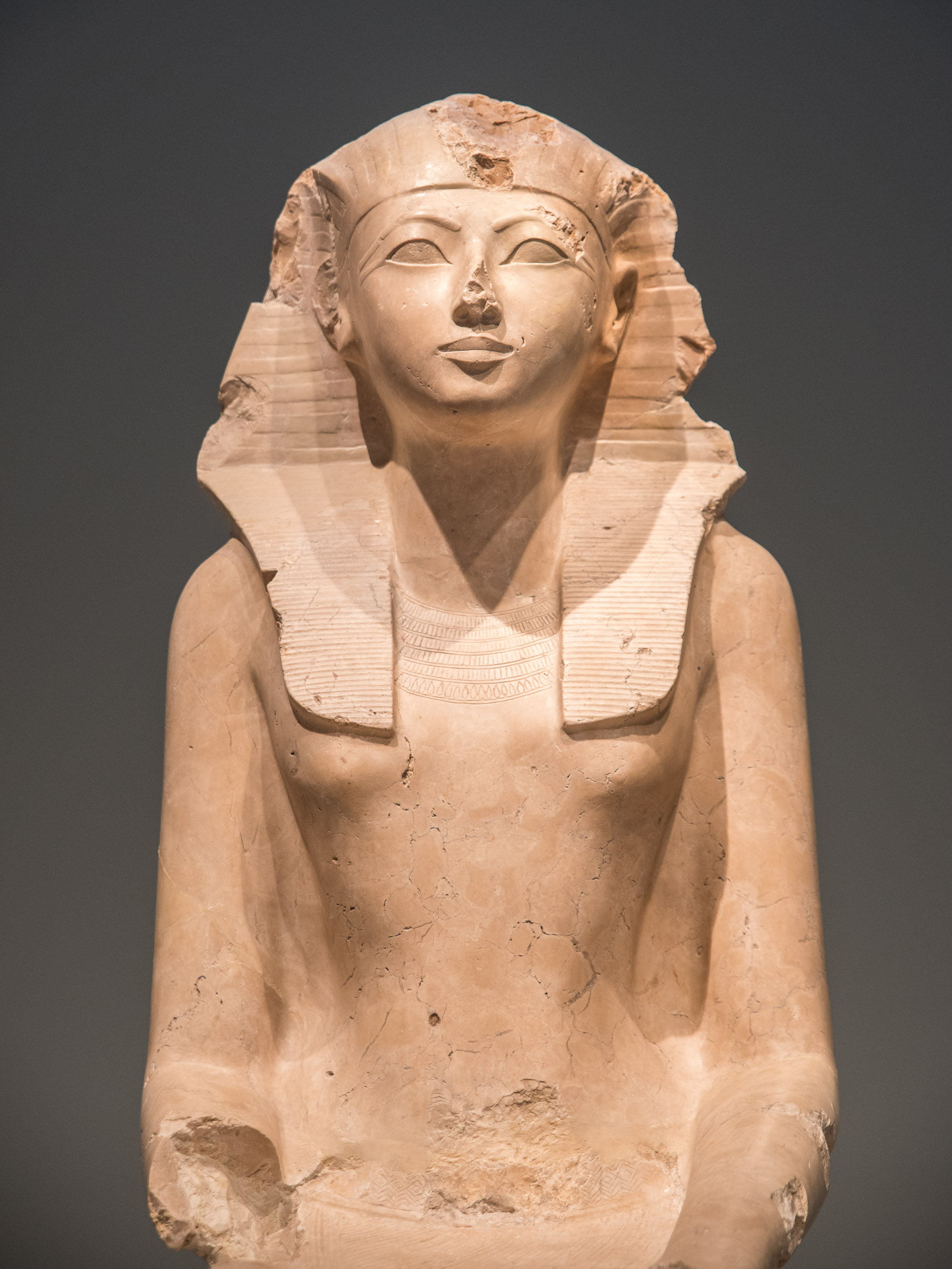 Una bellísima estauta de la faraona Hatshepsut en la que sus rasgos físicos femeninos apenas se insinuan.