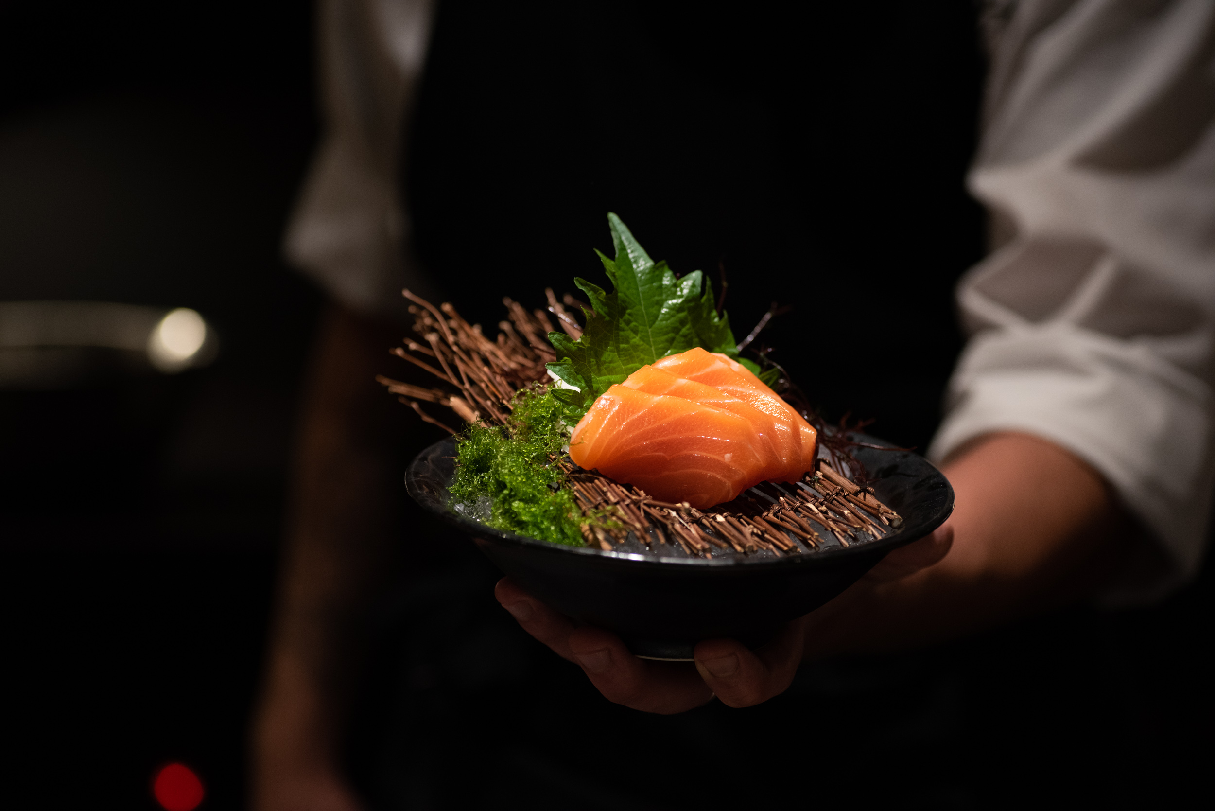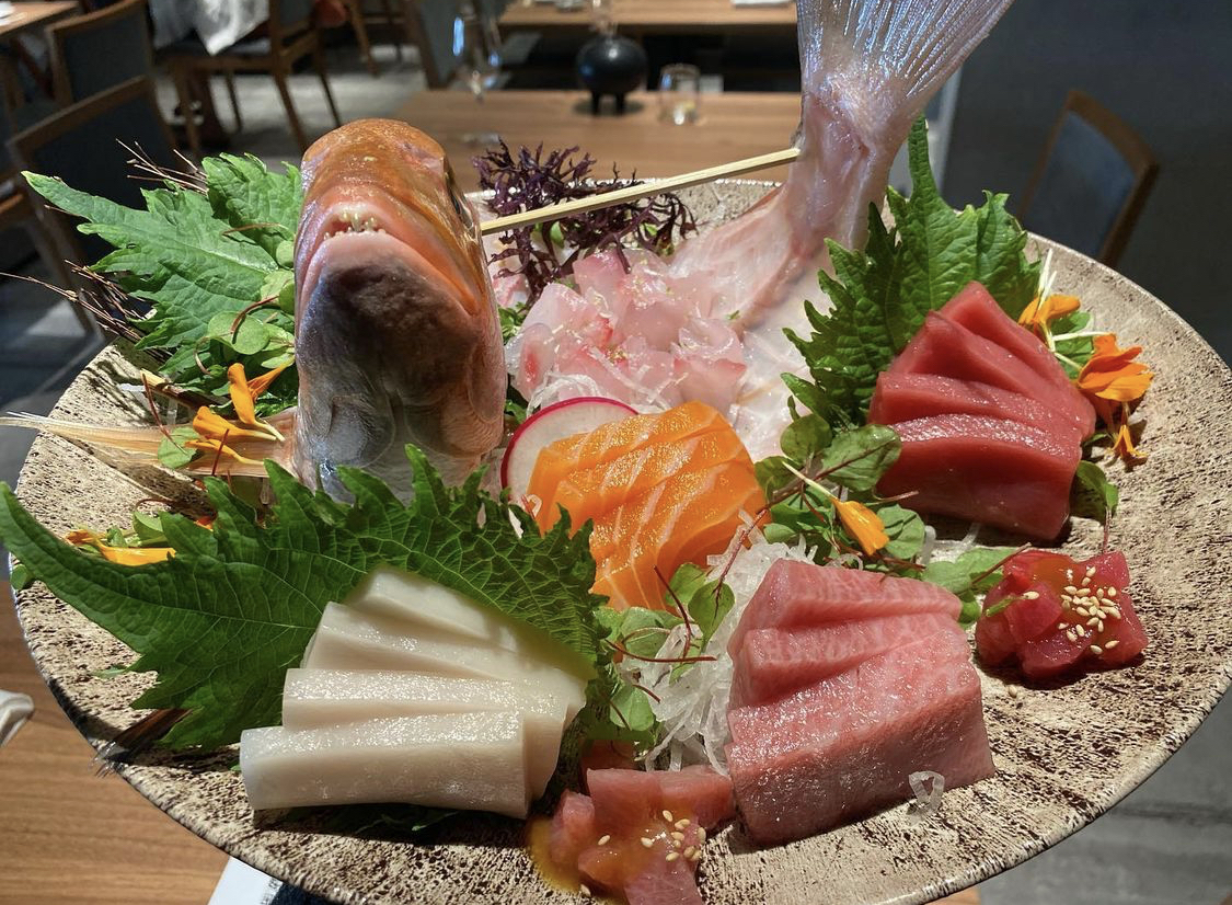 Salón comedor con un sashimi moriawase listo para disfrutar.