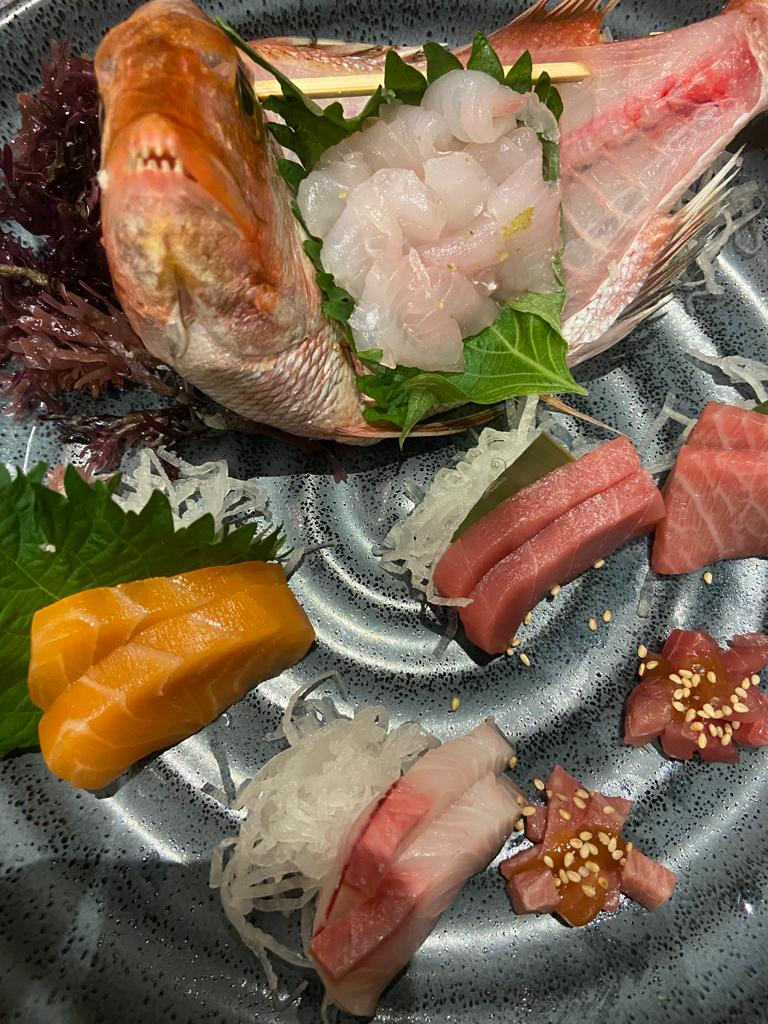 Sashimi moriawase de salmón, atún rojo, toro, pez limón y urta.