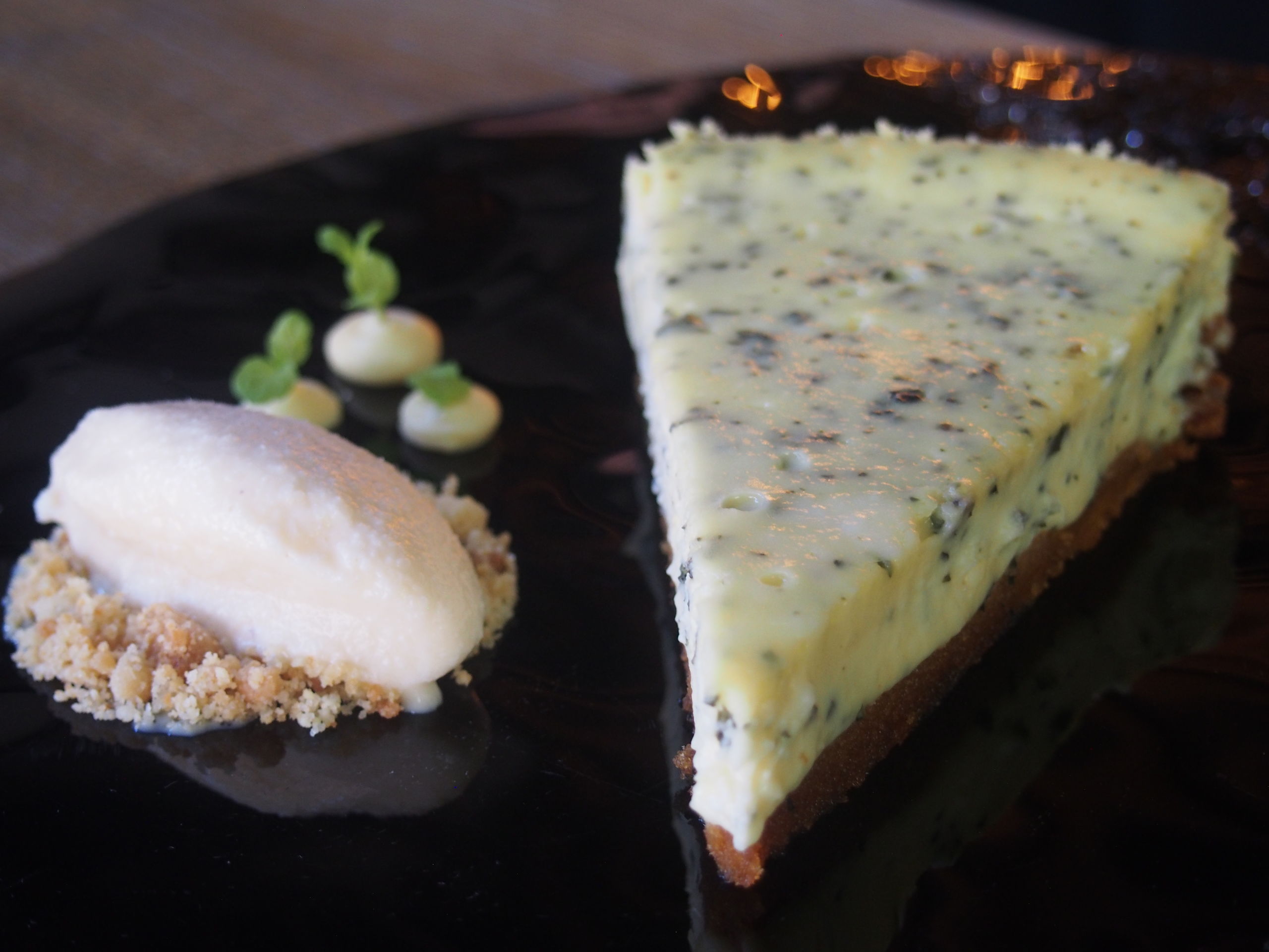 Flaó, es una cremosa tarta de queso de cabra y hierbabuena con helado casero de licor hierbas ibicencas.