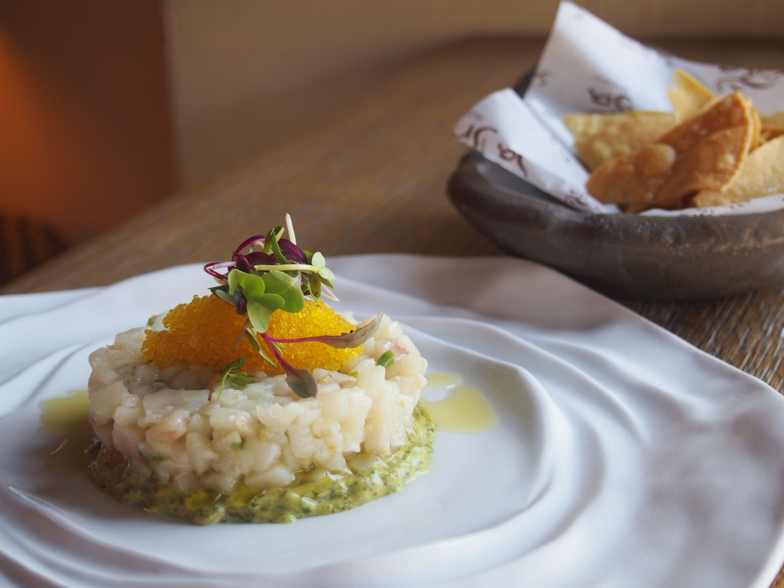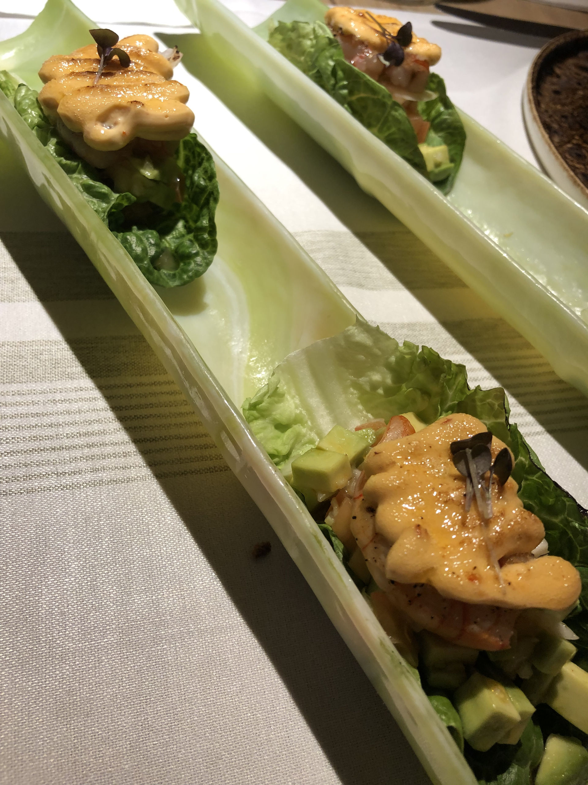 Gamba roja ibicenca sobre taco de lechuga con aderezo de Chipotle.