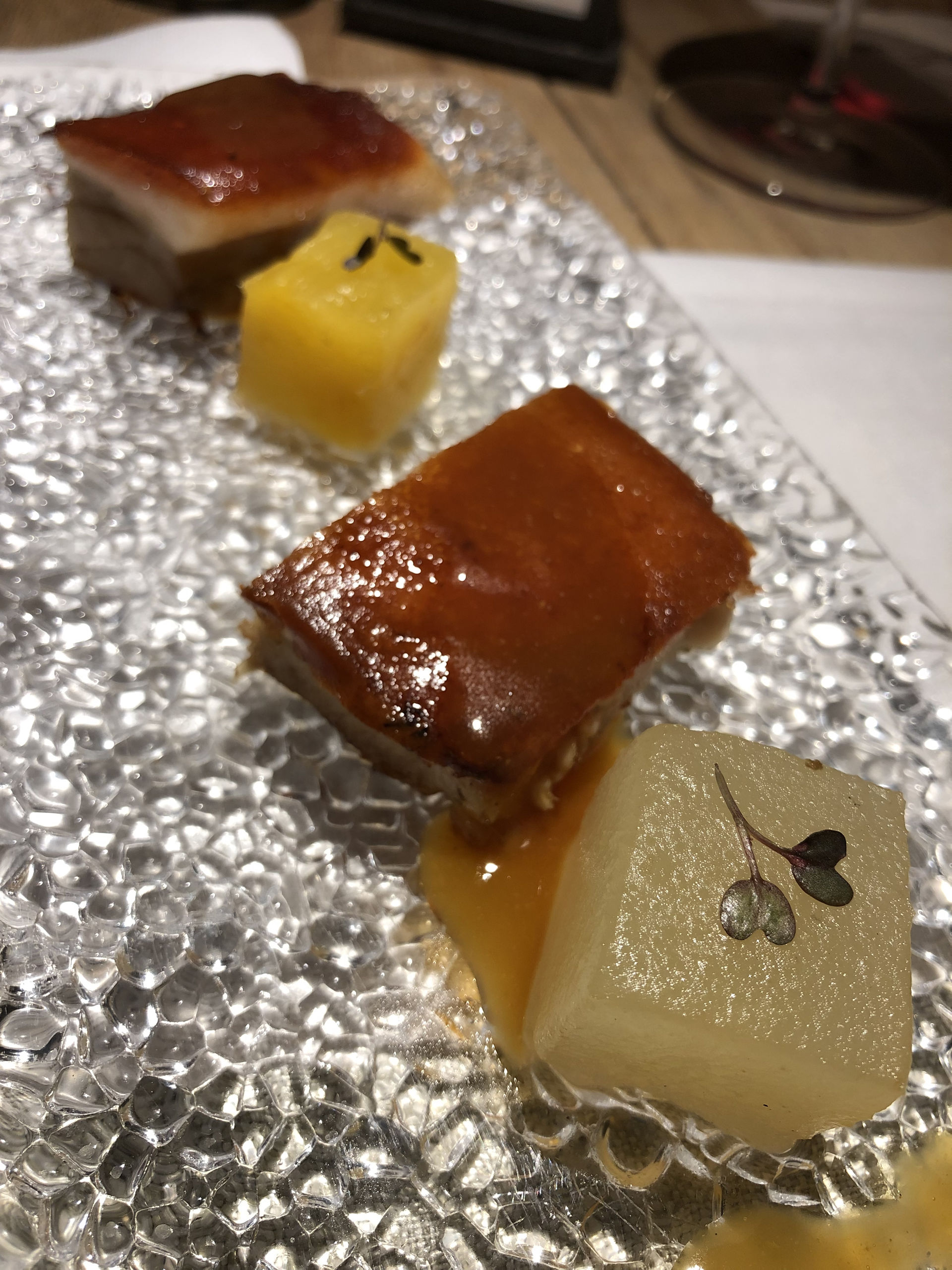 Cochinillo deshuesado en su jugo y frutas encurtidas de temporada.