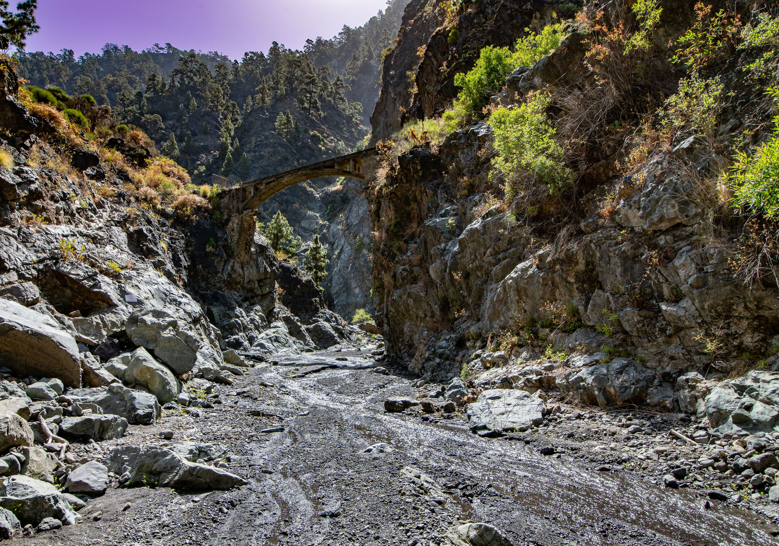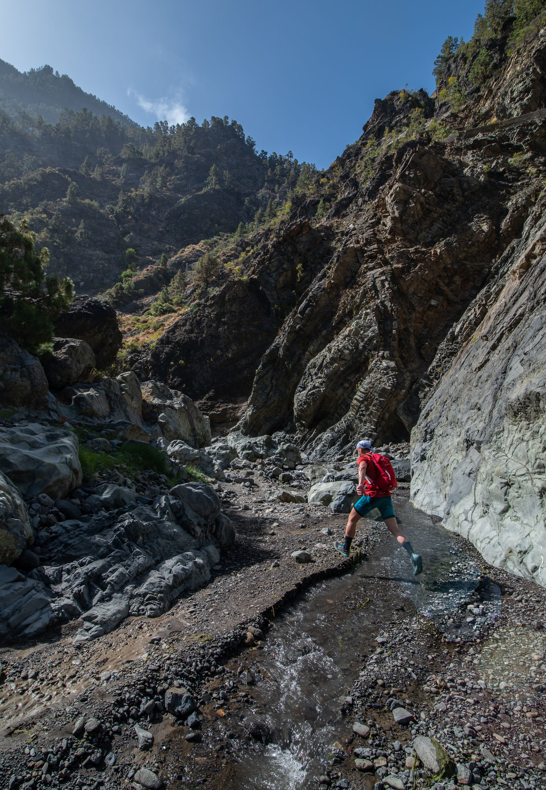 Un excursionista salta uno de los muchos arroyos que llenan el Barranco de las Angustias.