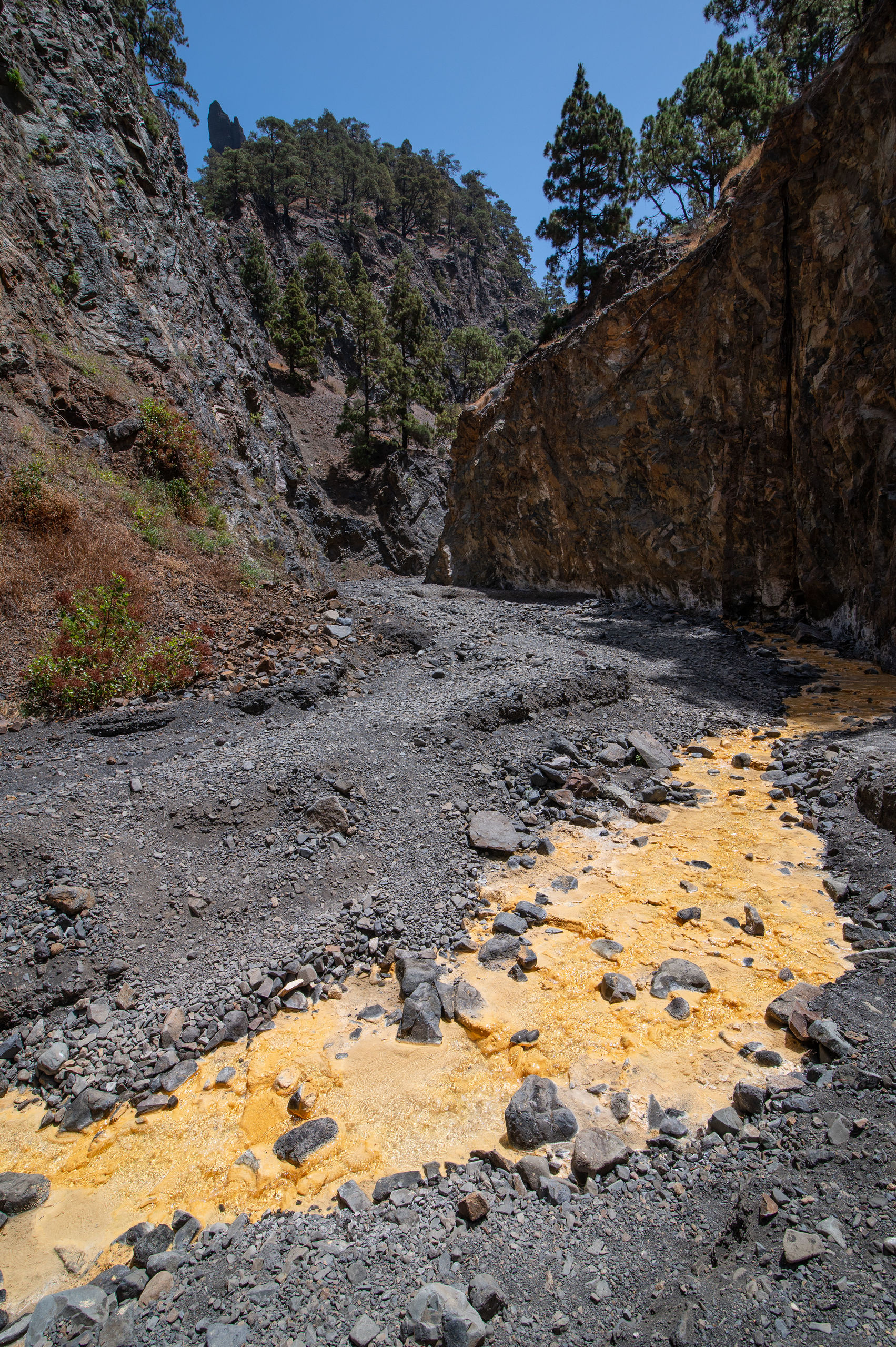 En un tramo del barranco una fuente de aguas sulfurosas tiñe de amarillo la corriente.