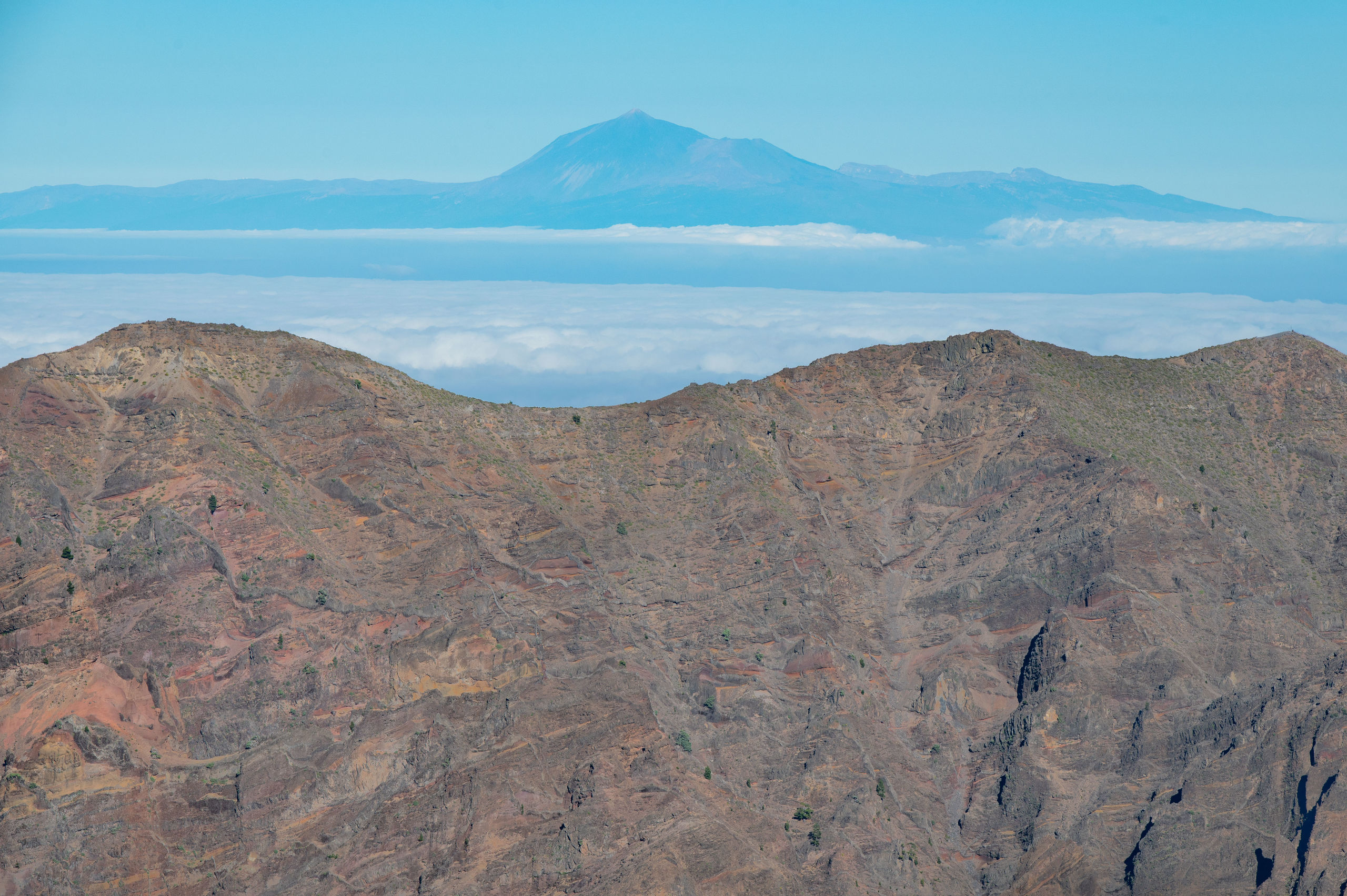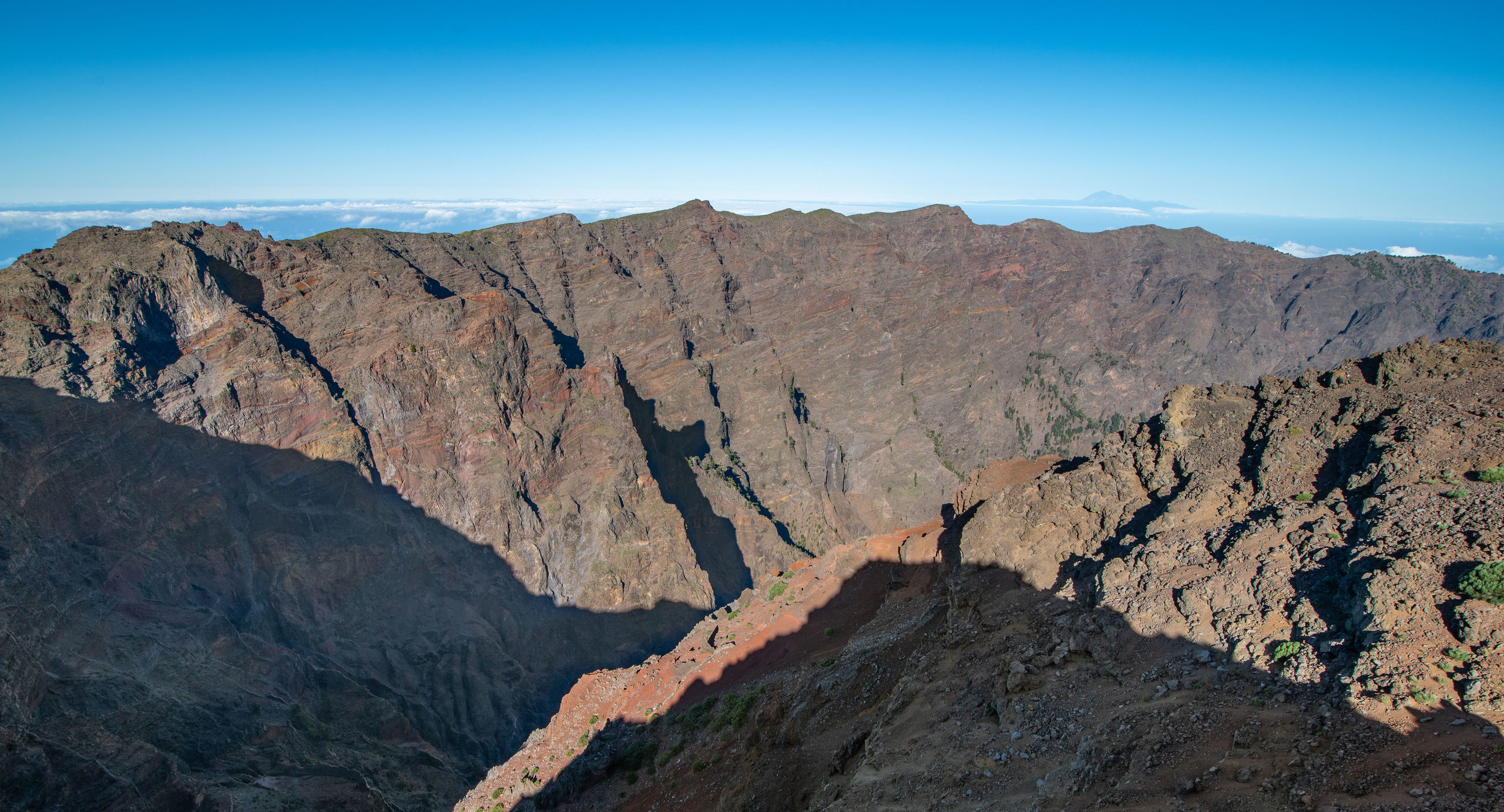 Las paredes de la Caldera de Taburiente y, al fondo, Tenerife y el Teide.