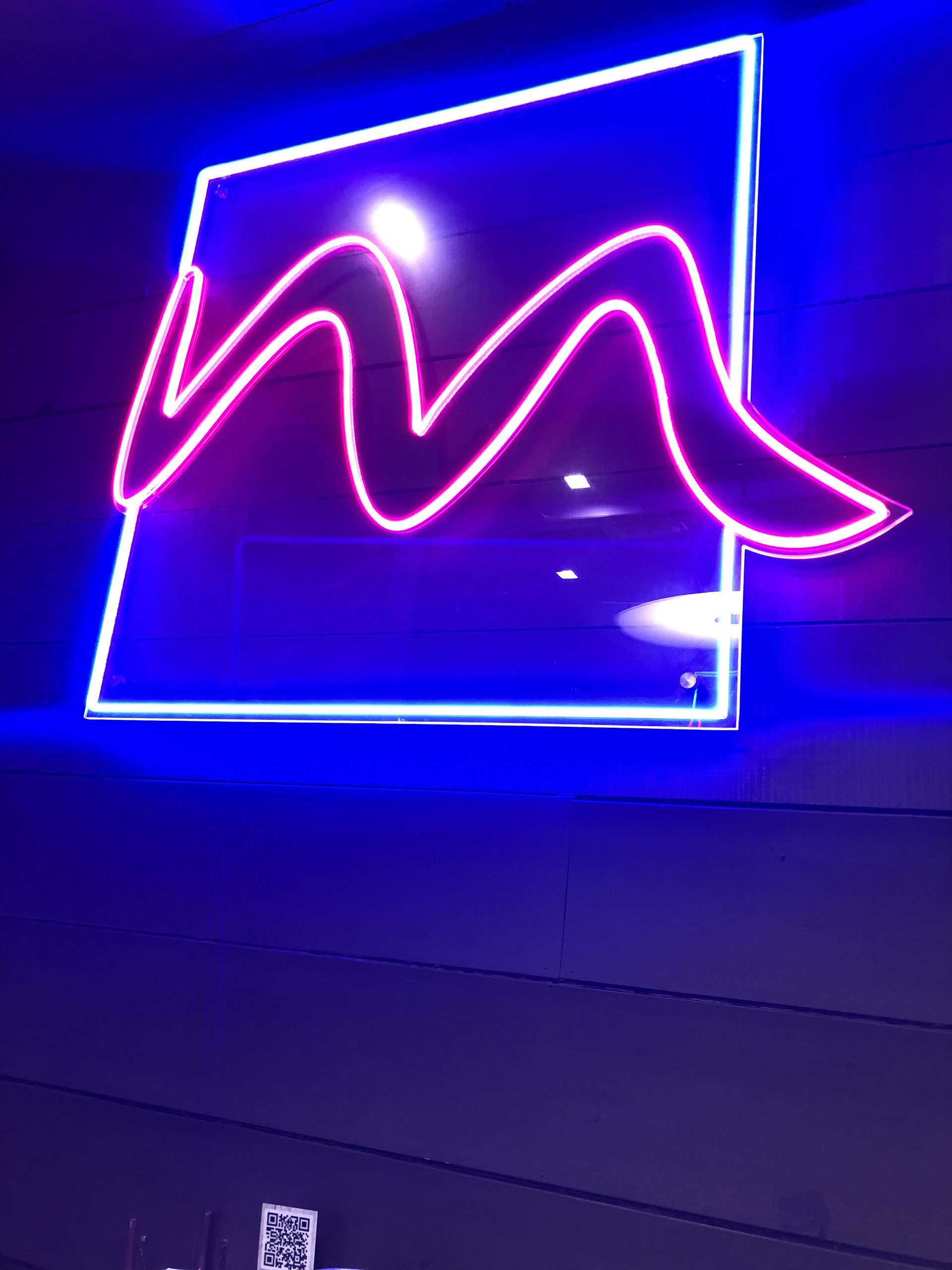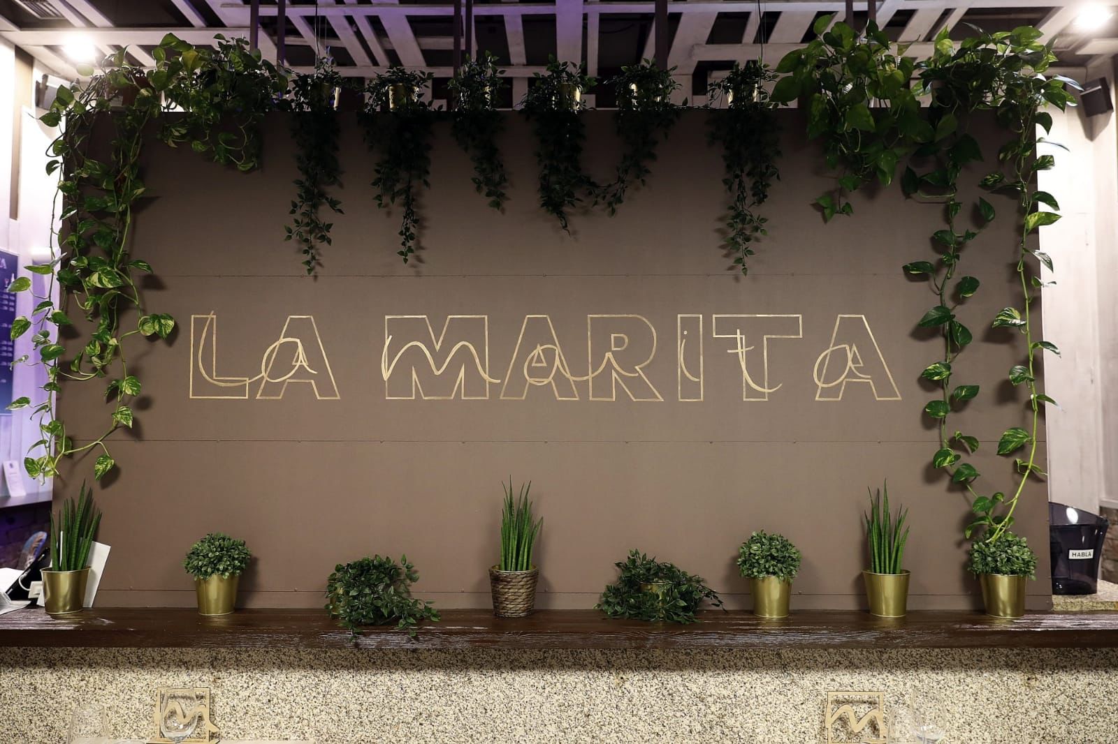 Un neón con la 'M' de La Marita que decora otra de las paredes del bar.