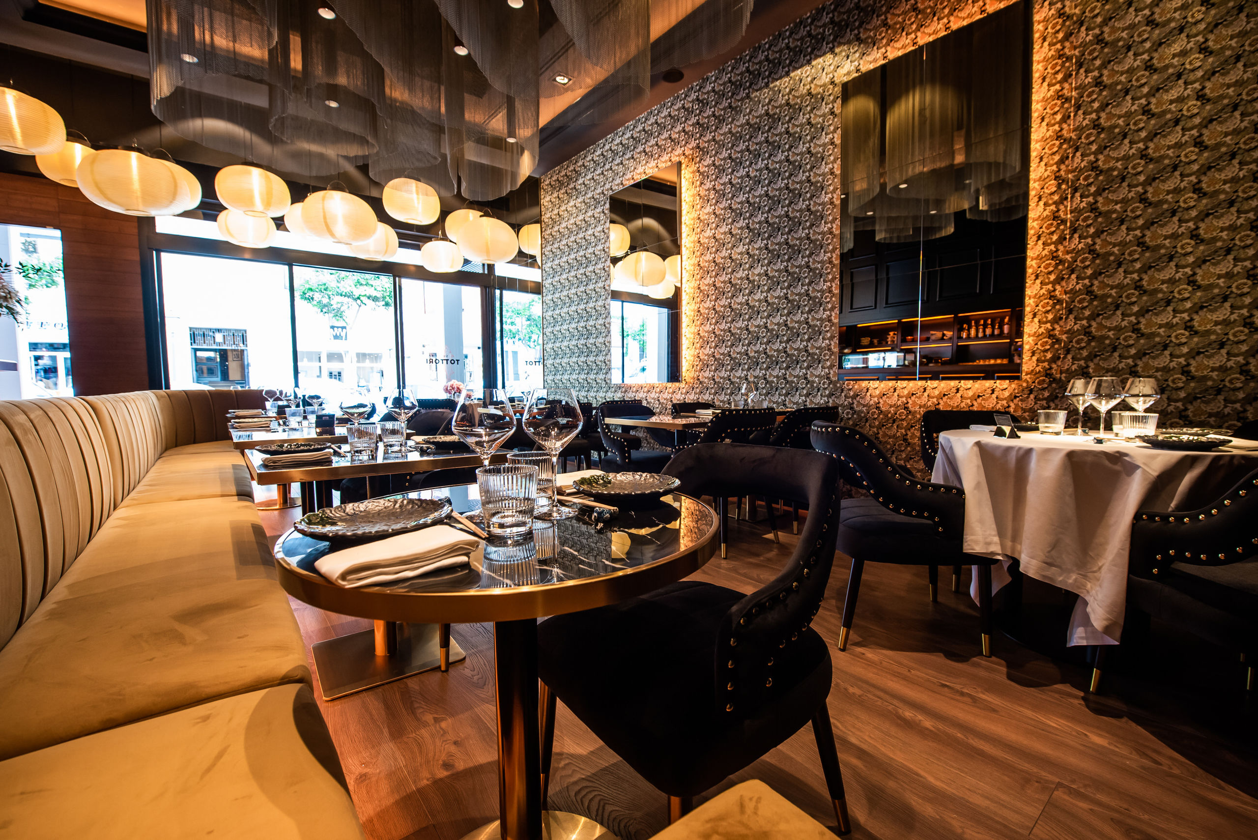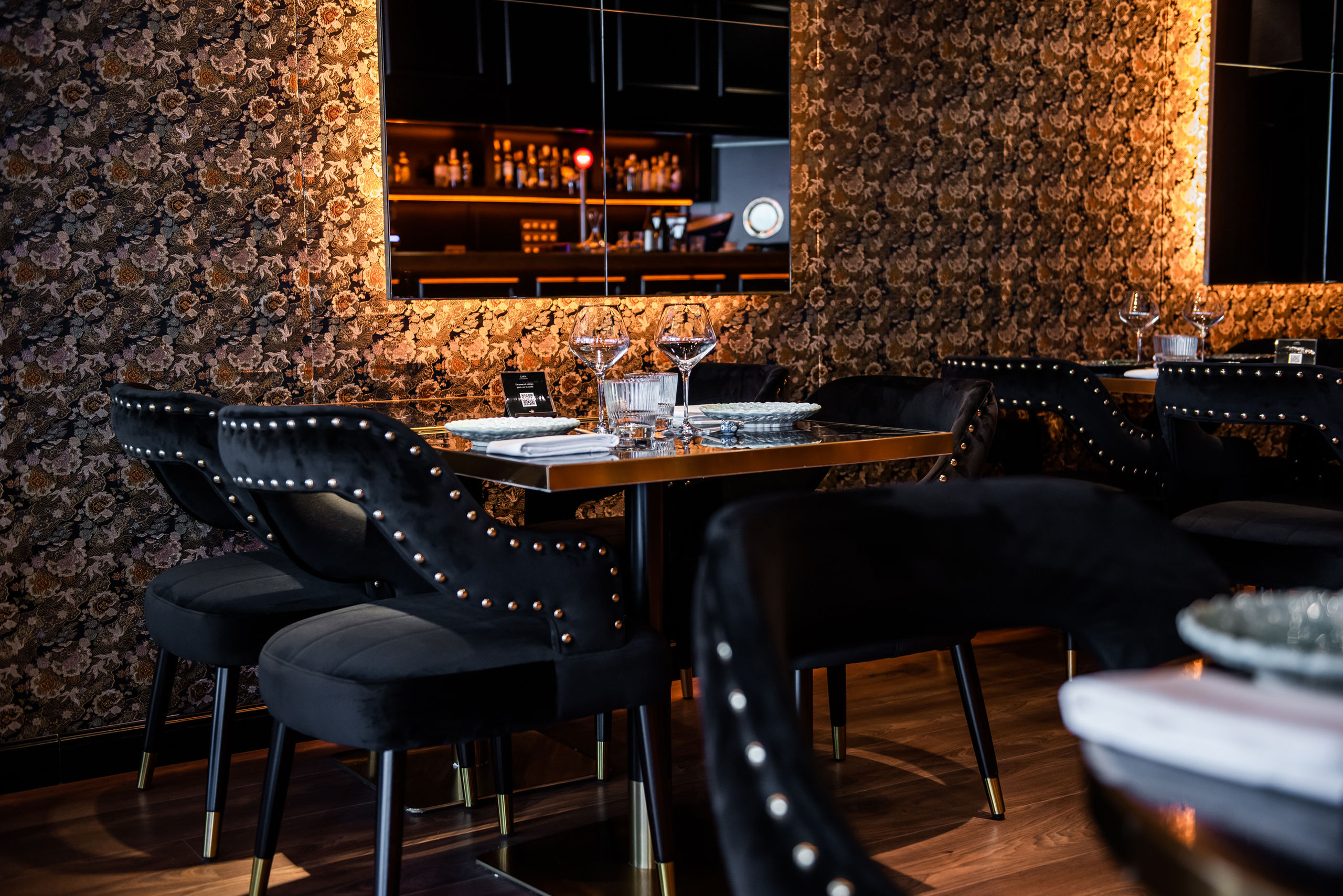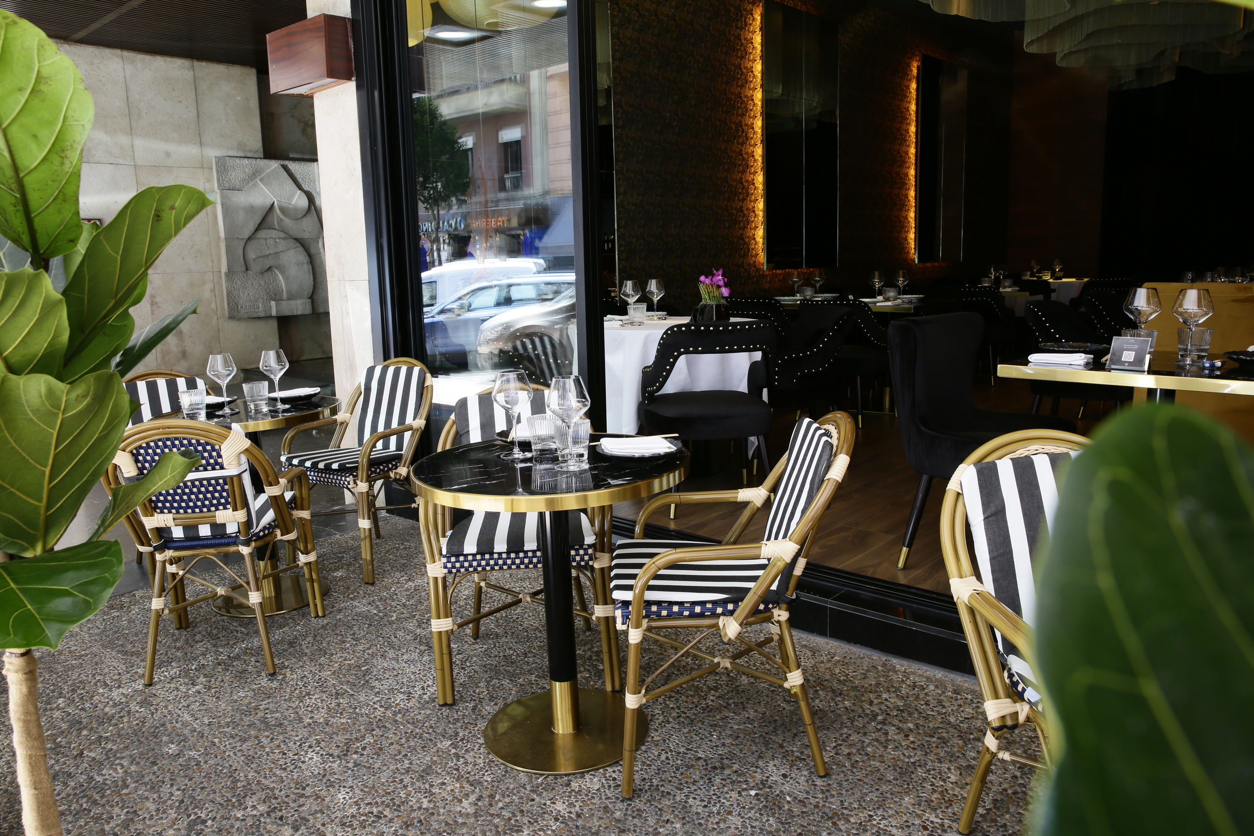 Mesas de metal con dorados contrastan con butacas de terciopelo en una decoración que cuida hasta el mínimo detalle.