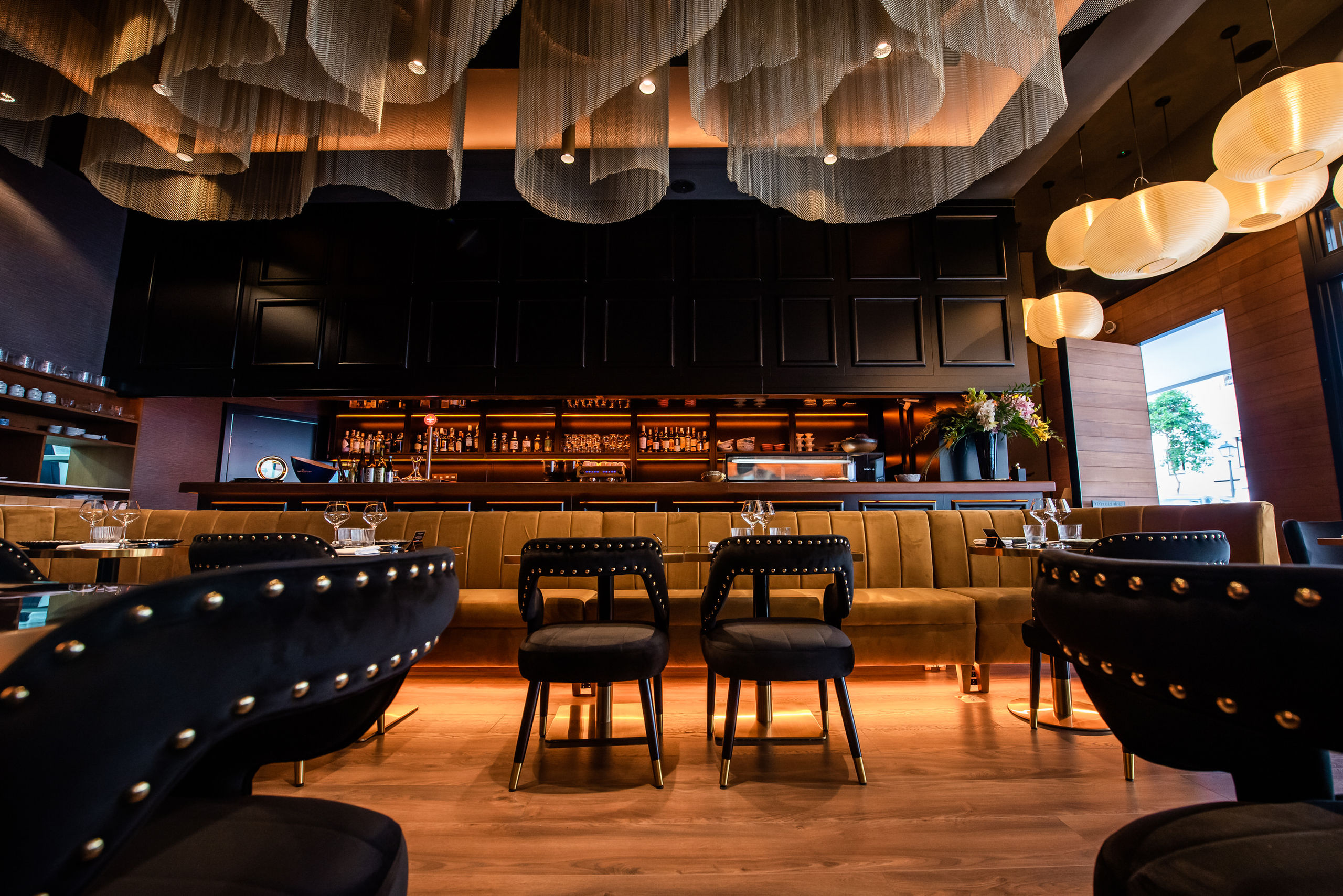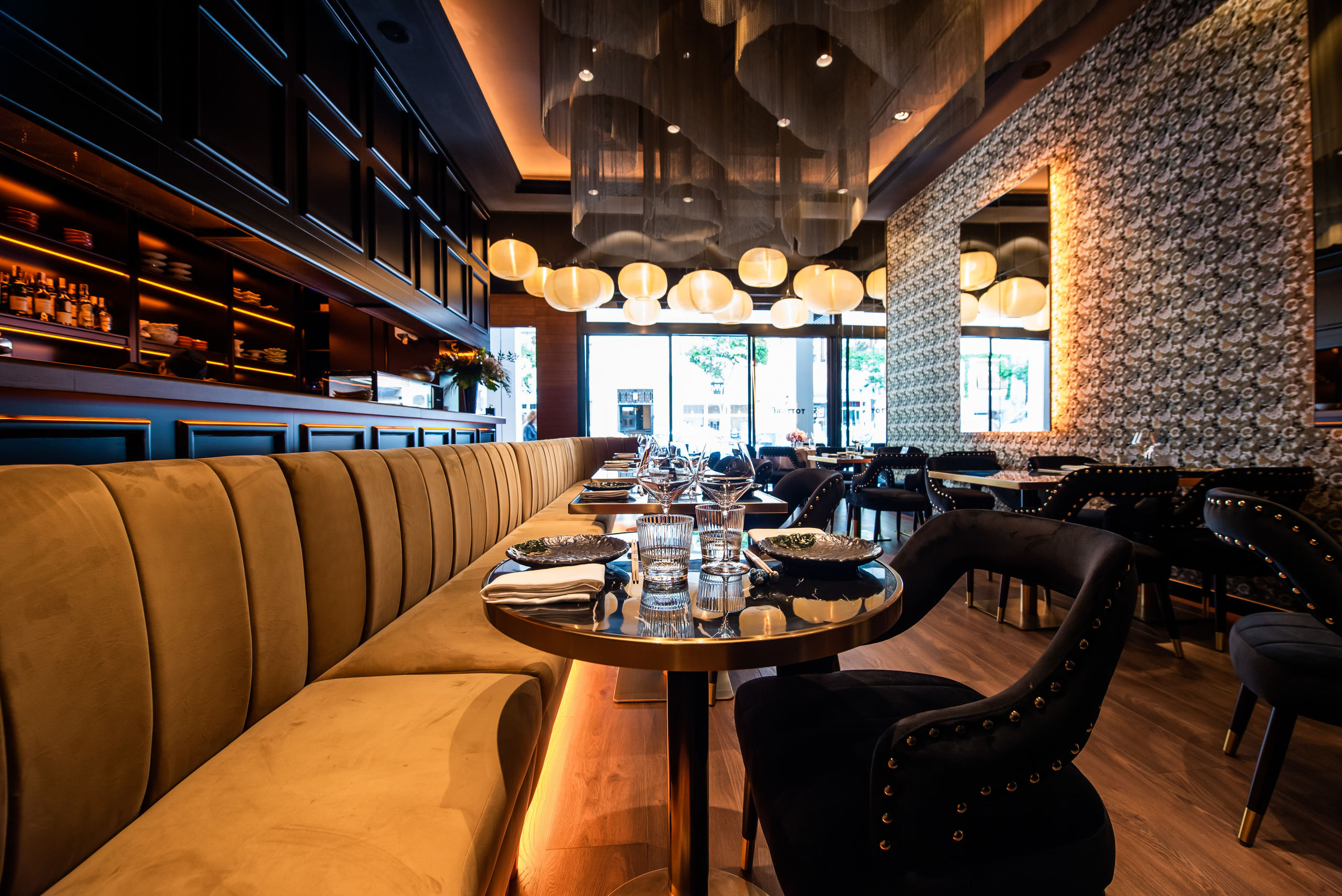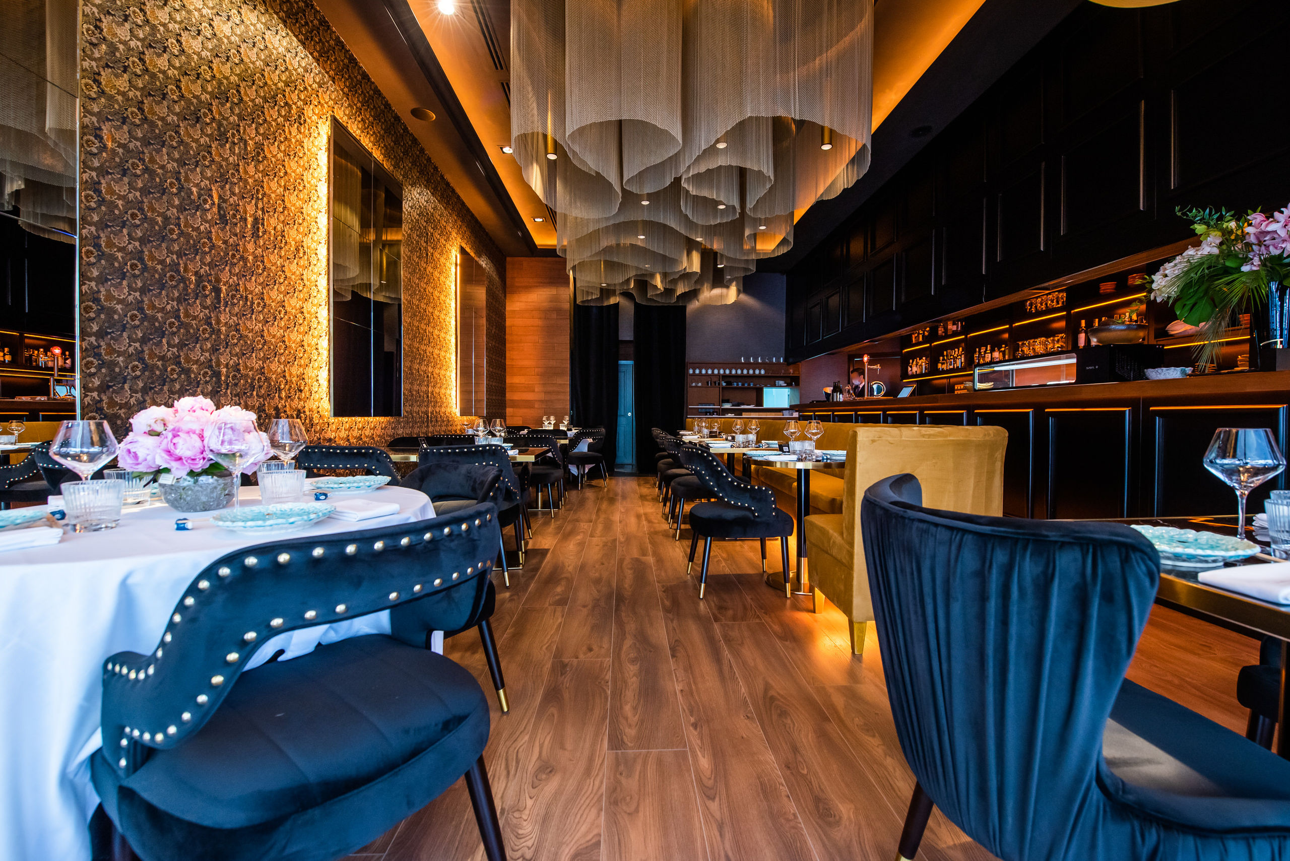 Mesas de metal con dorados contrastan con butacas de terciopelo en una decoración que cuida hasta el mínimo detalle.