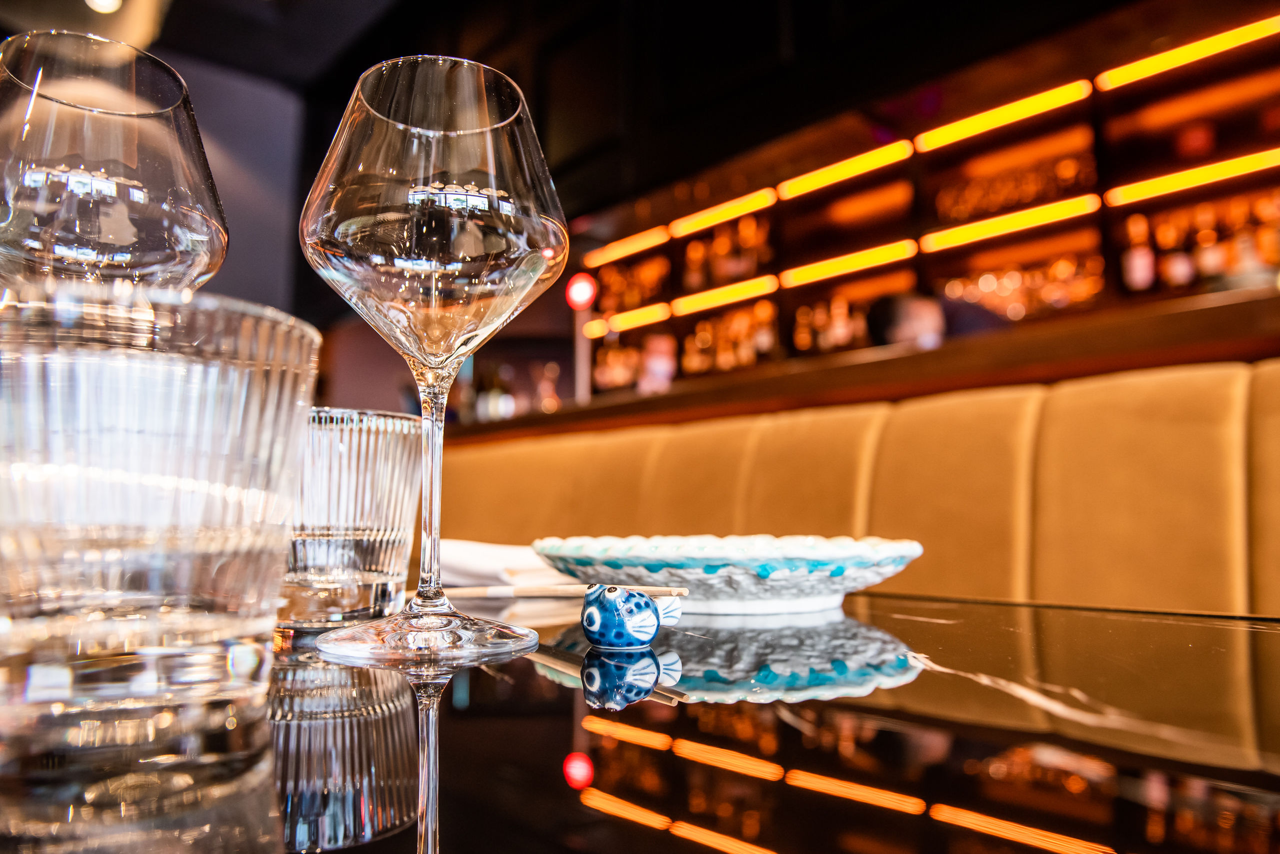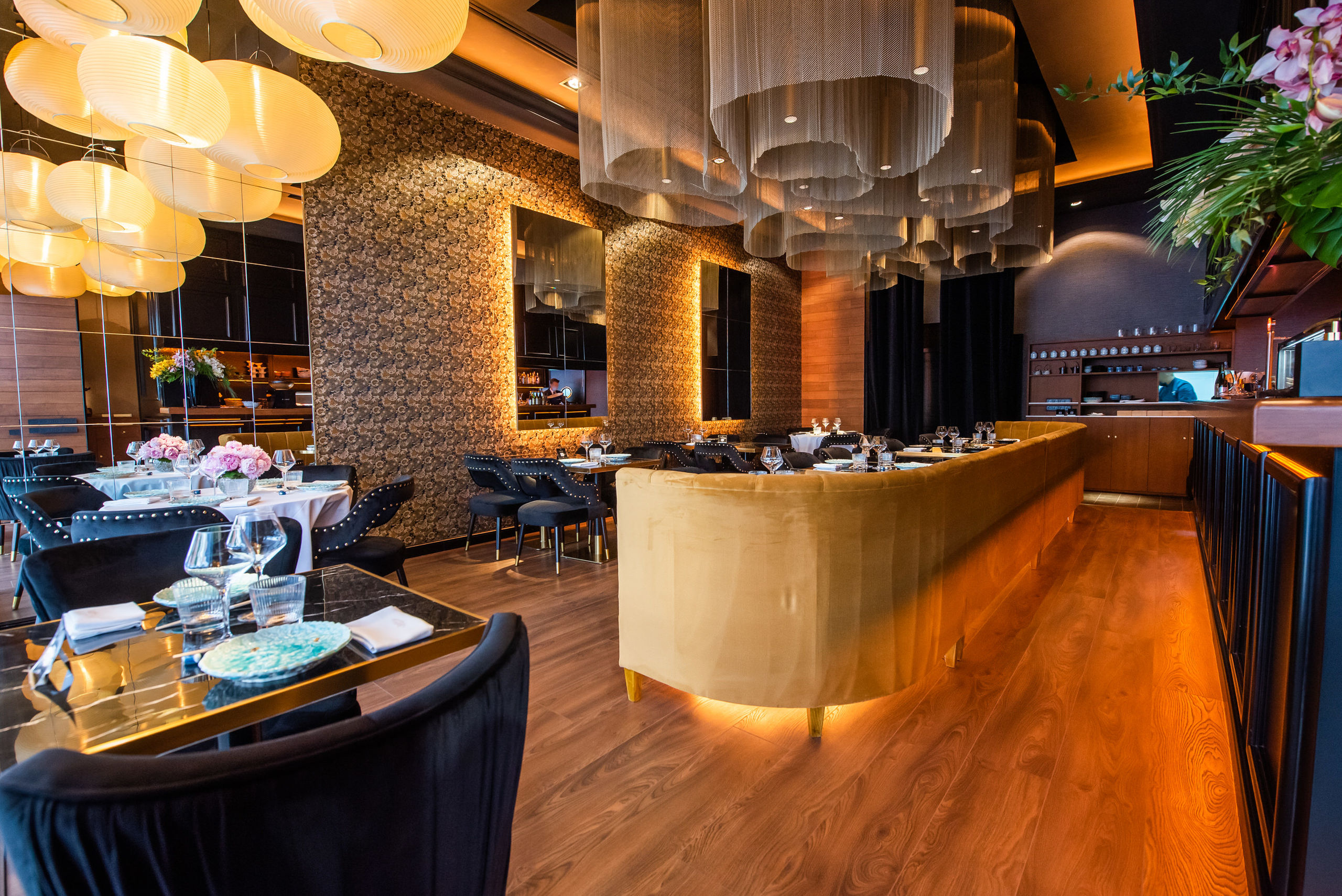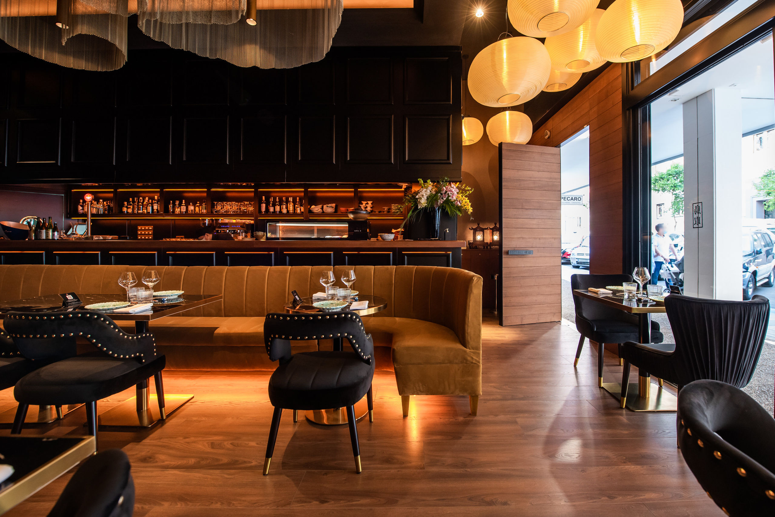 Las butacas de tercipelo se unen a las paredes empapeladas con telas de hilo de oro para crear un ambiente típico japonés.