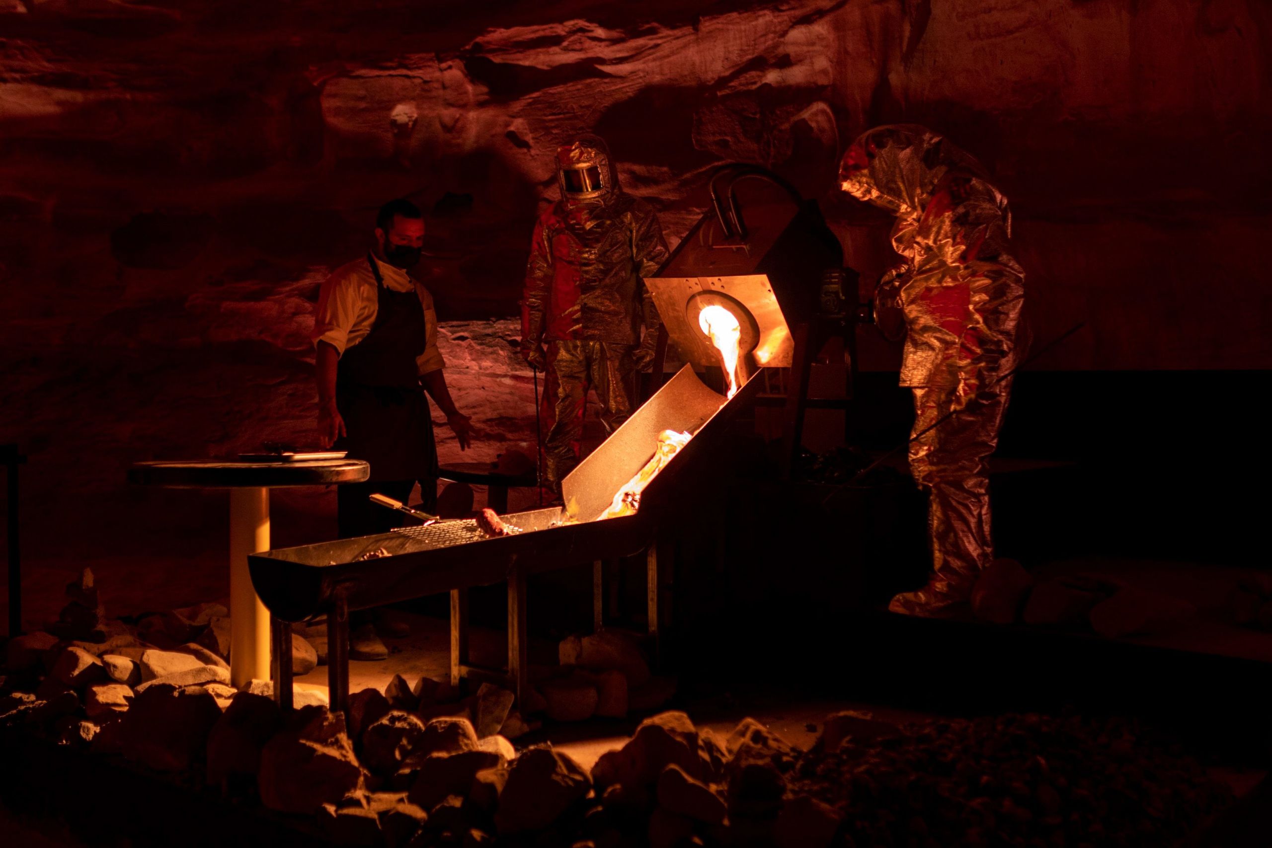 Los cocineros de esta nueva experiencia en Arabia Saudi tienen que ir bien protegidos durante su jornada. La lava incandescente es peligrosa.