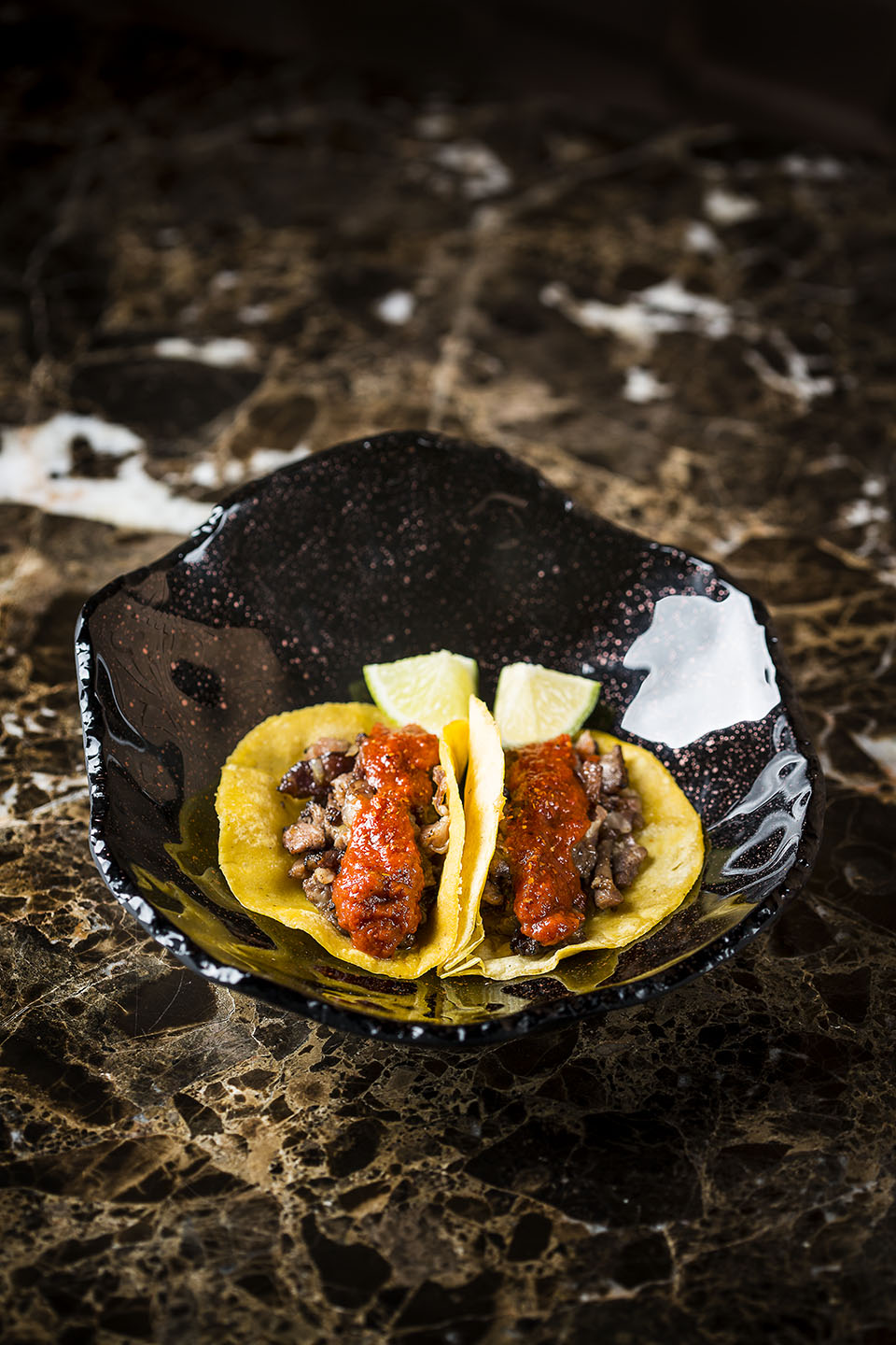 Taco de cerdo ibérico de bellota a la brasa con salsa pibil.