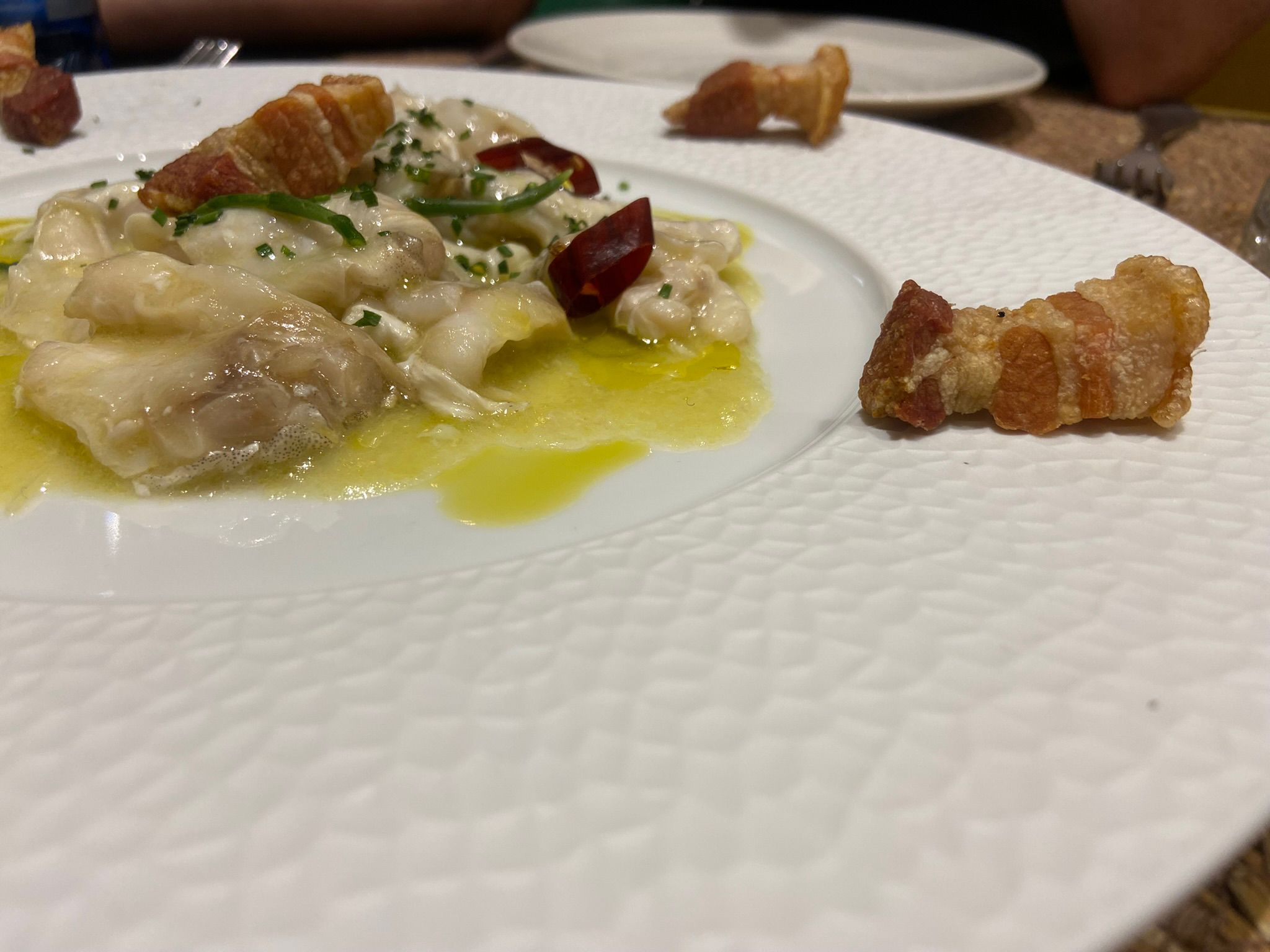 Cocochas de bacalao al pilpil con torreznos crujientes de la casa.