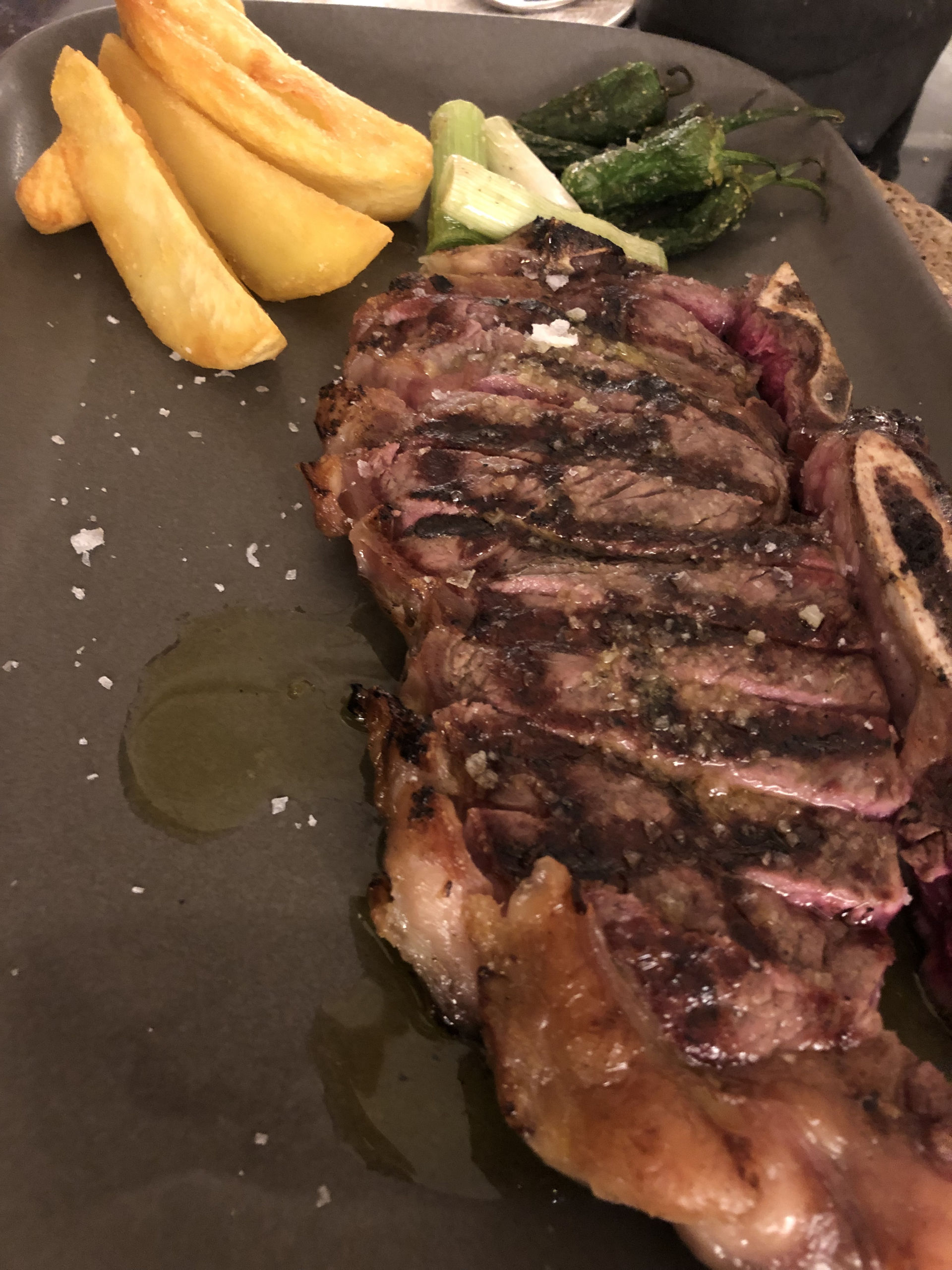 Lomo de vaca al carbón con guarnición de puerros y patatas fritas triple cocción.