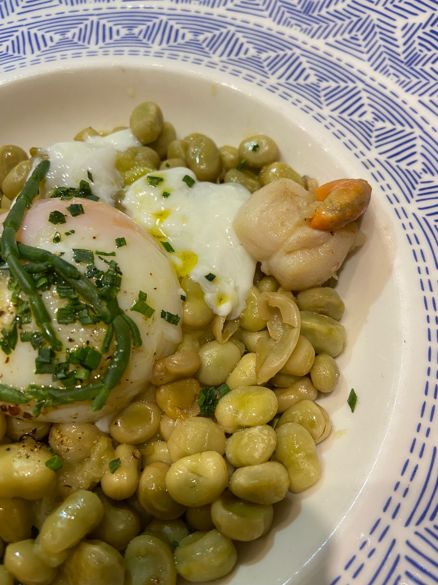 Zamburiñas con habitas baby, huevo de corral a baja temperatura y patatas a la brasa.