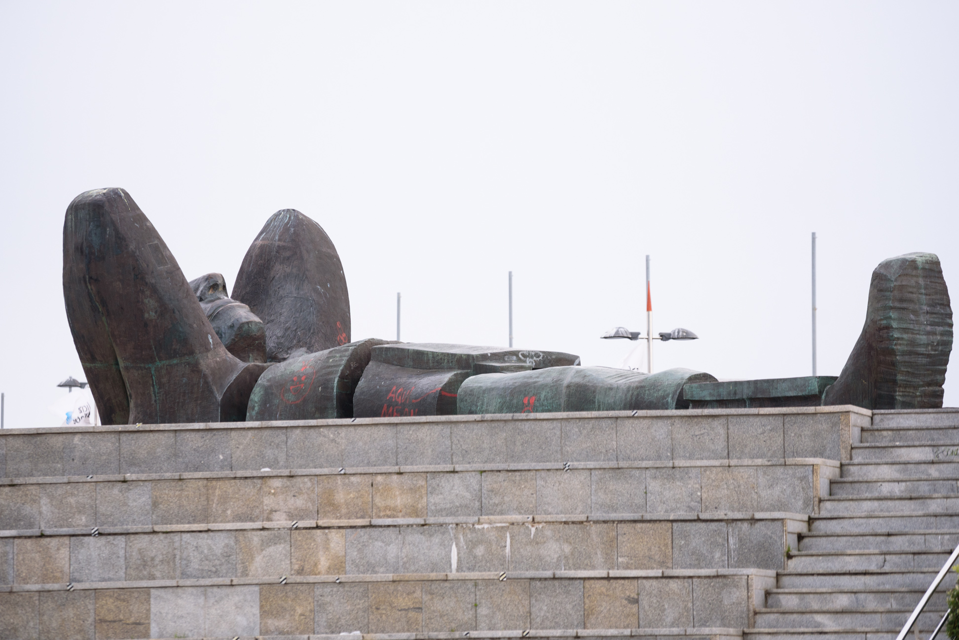 Escultura de un hombre tumbado en la zona peatonal del puerto deportivo, junto al Real Club Náutico.