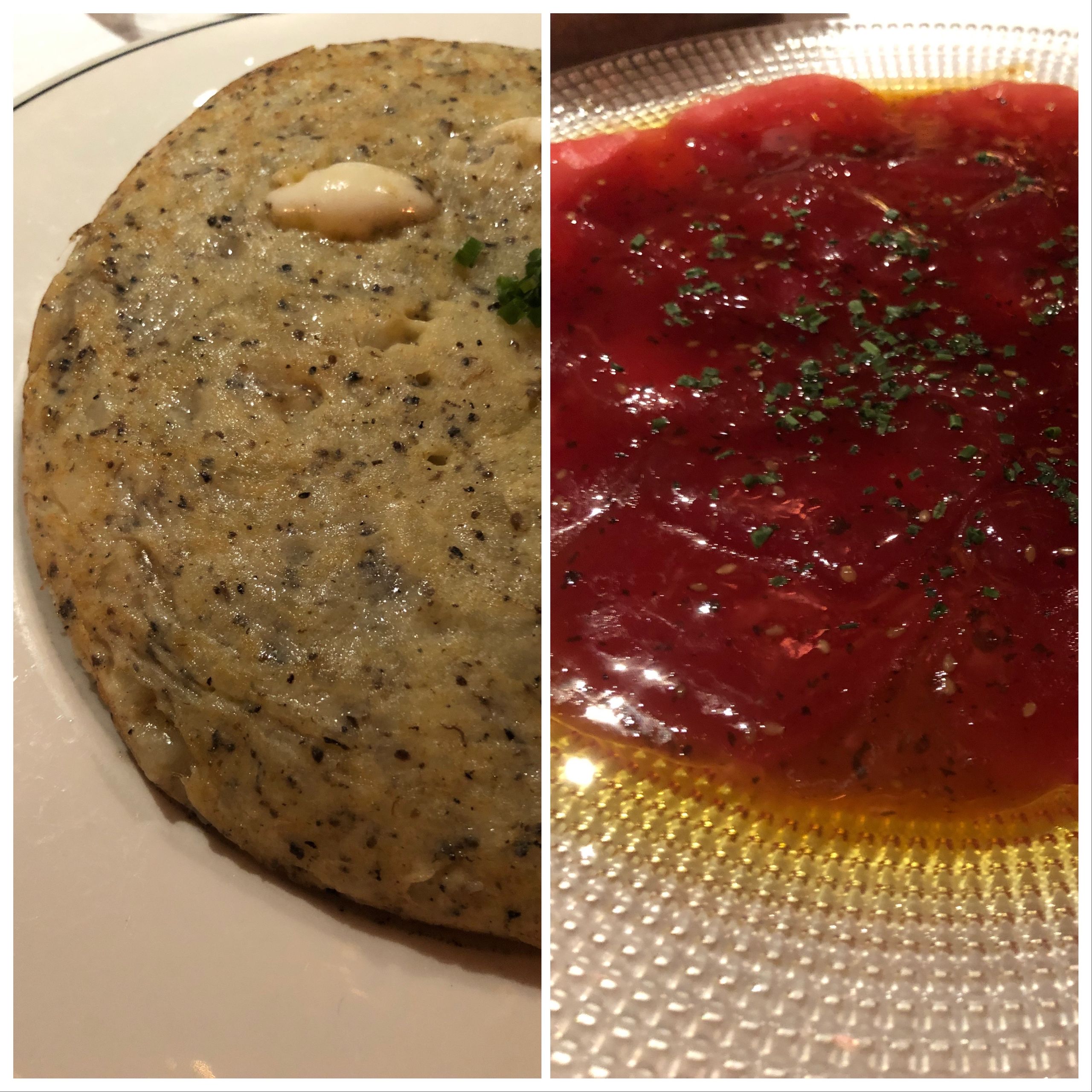 La calidad del producto lo comprobamos con un exquisito atún rojo muy fino aliñado con el AOVE TATEL (32€). También puedes disfrutar con uno de los clásicos del restaurante, la tortilla trufada (19€).