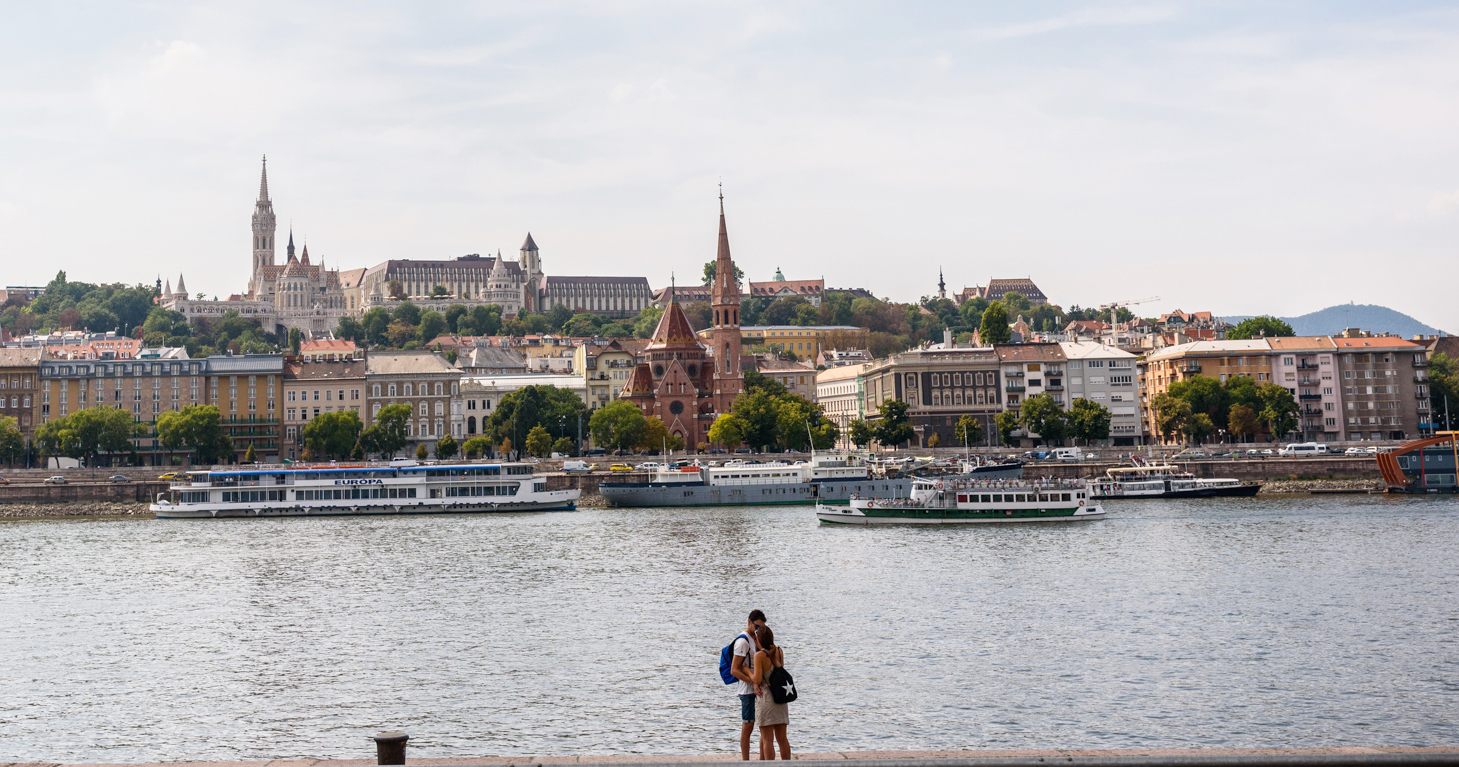 Una pareja de enamorados se besan frente a Buda, en Budapest, con el río Danubio de fondo.
