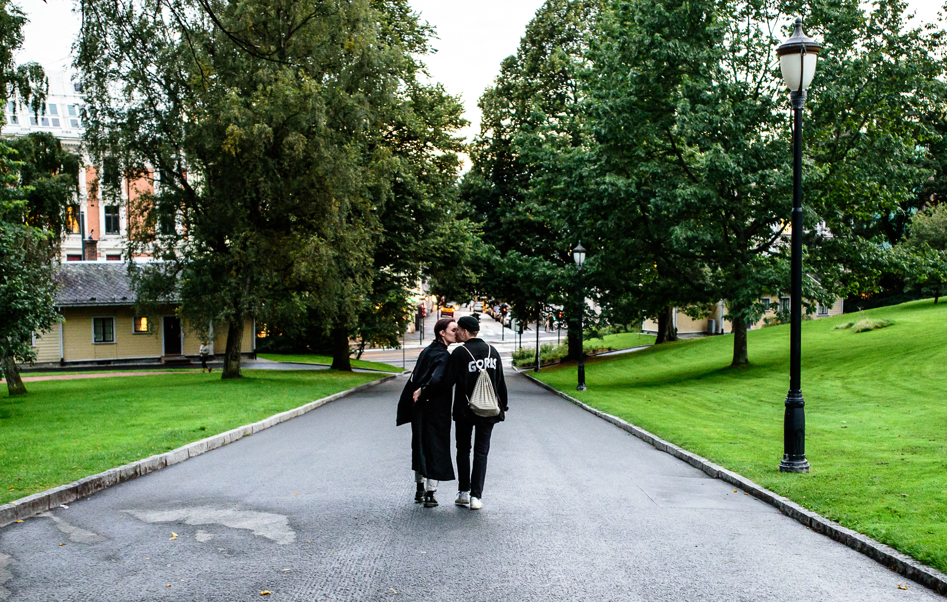 Una joven pareja se besa en las inmediaciones del parque del palacio real de Oslo, en Noruega.
