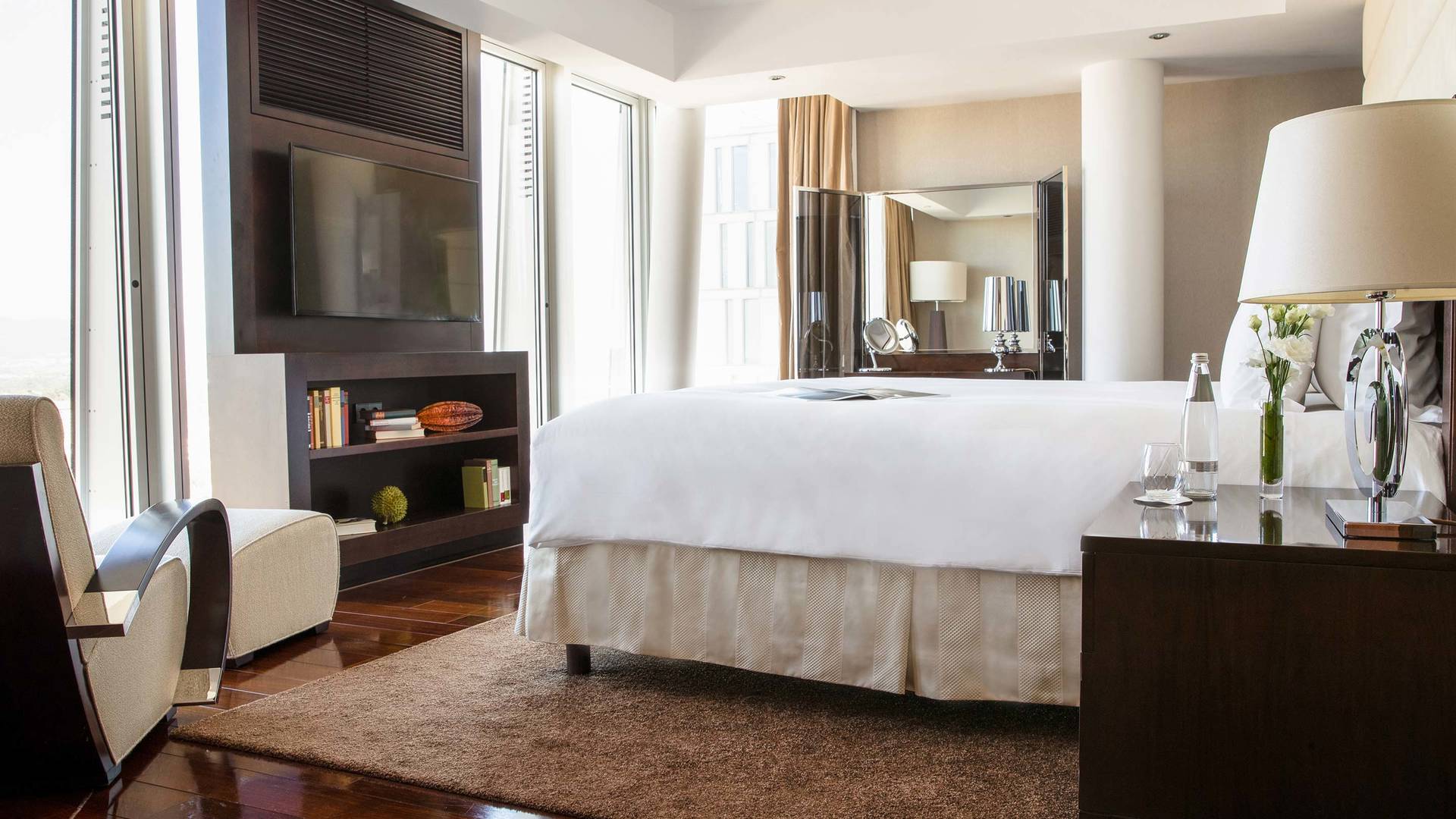 Con dos amplios dormitorios principales y una gran sala de estar y comedor, la suite del Al Bustan Palace Ritz-Carlton Hotel, en Omán, puede albergar hasta cinco personas, con un comedor con capacidad para ocho. La suite también cuenta con un baño completo de mármol y vistas panorámicas completas desde el balcón, con vista al mar de Omán, y costará a los huéspedes unos 5500 euros por noche.